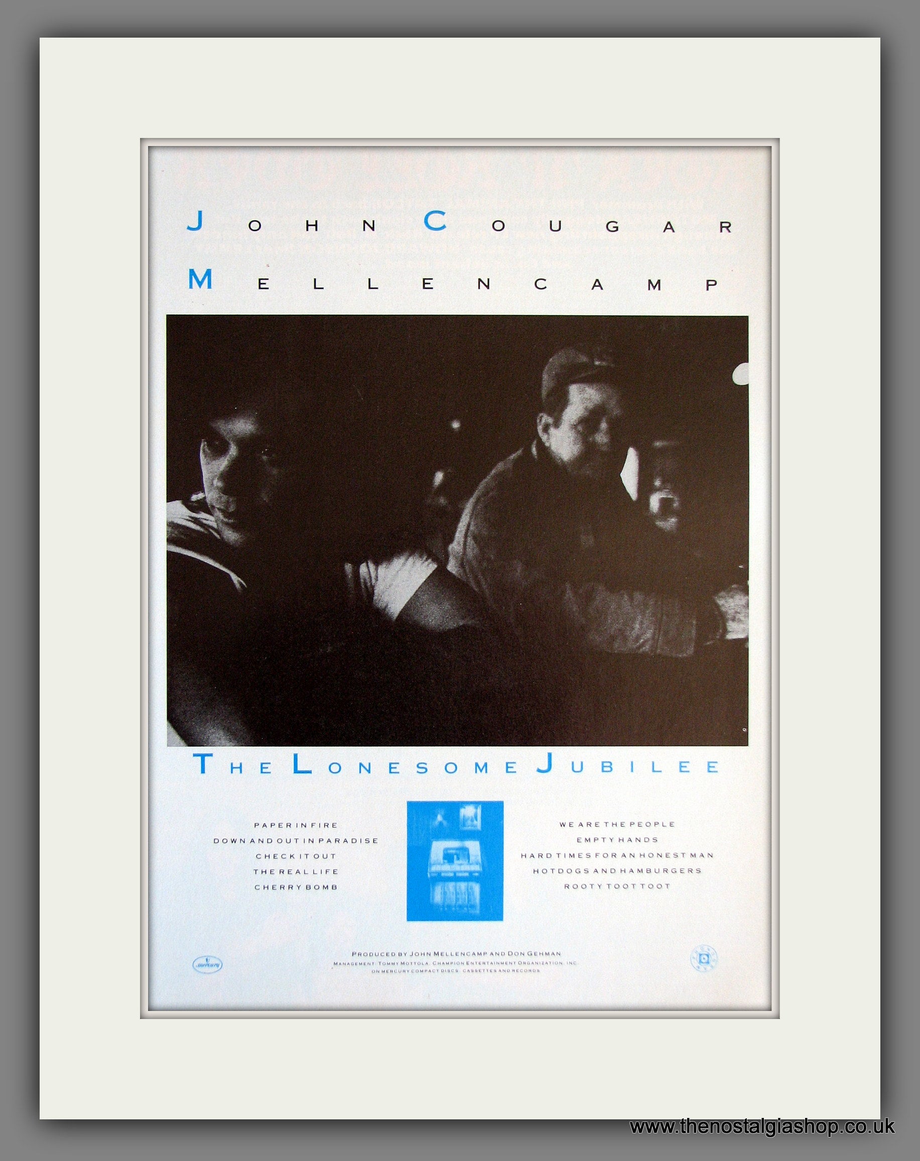 John Cougar Mellencamp. Lonesome Jubilee. Vintage Advert. Classic Original Advert 1987. Presented and Supplied in a cream bevel cut mount with backing card and display bag. Ready to fit in 14 x 11 inch frame. Want it framing? If so, buy this then go to Frames Available Category. Click to buy on the suitable frame and we will do the rest. All our adverts, unless clearly stated are Originals from the date shown. They make excellent pieces of wall art and stunning gifts. Many are rare and hard to find and once sold, may not be replaced. Remember you are buying a piece of history. Website watermark is not on original.