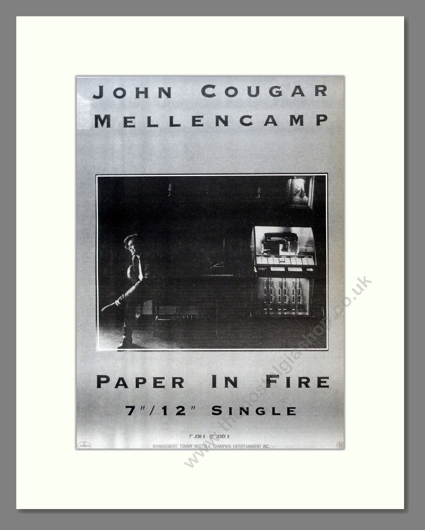 John Cougar Mellencamp - Paper In Fire. Vintage Advert. This is a large classic original advert from 1987. Presented and supplied in a cream bevel cut mount with backing card and clear bag. Ready to fit in a 20 x 16 inches frame. The mounted advert will be posted via courier and well packed - protected with a sheet of hardboard to keep it rigid. Any questions or enquiries, please get in touch, we are here to help! All our adverts, unless clearly stated are originals from the date shown. They make excellent pieces of wall art and stunning gifts. Many are rare and hard to find and once sold, may not be replaced. Remember you are buying a piece of history. Website watermark is not on original.
