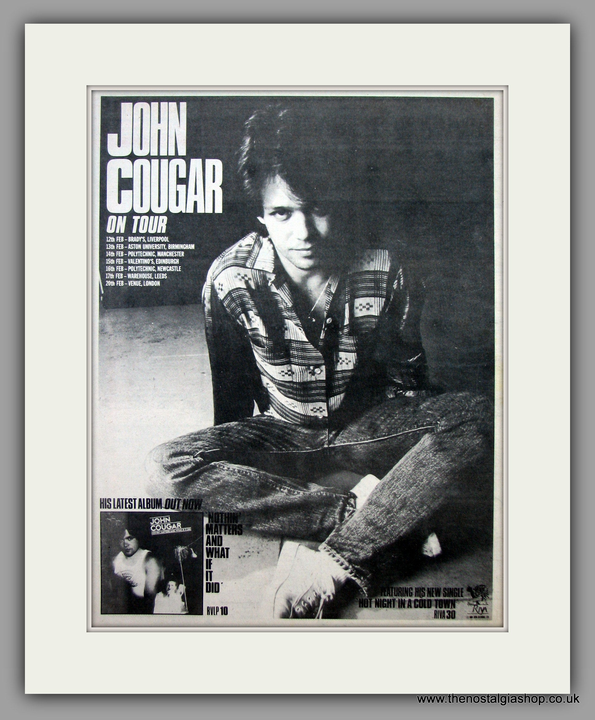 John Cougar. UK Tour Dates. Original Vintage Advert 1981 (ref AD10437). Presented and supplied in a cream bevel cut mount with backing card and clear bag. Ready to fit in a 20x16 inch frame. The mounted advert will be posted via courier and well packed - protected with a sheet of hardboard to keep it rigid. Any questions or enquiries, please get in touch, we are here to help! All our adverts, unless clearly stated are originals from the date shown. They make excellent pieces of wall art and stunning gifts. Many are rare and hard to find and once sold, may not be replaced. Remember you are buying a piece of history. Website watermark is not on original.