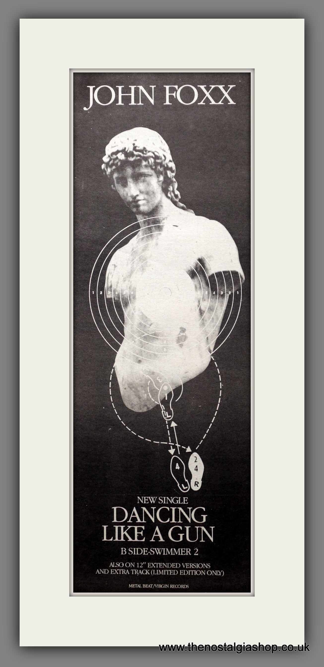 John Foxx Dancing Like A Gun. This is a large Original Vintage Advert 1981. Presented and Supplied in a cream, bevel cut mount with backing card and clear bag. Ready to fit in 20 x 10 inch frame. The mounted advert will be posted via courier and well packed - protected with a sheet of hardboard to keep it rigid. Any questions or inquiries, please get in touch, we are here to help! All our adverts, unless clearly stated are Originals from the date shown. They make excellent pieces of wall art and stunning gifts. Many are rare and hard to find and once sold, may not be replaced. Remember you are buying a piece of history. Website watermark is not on original.