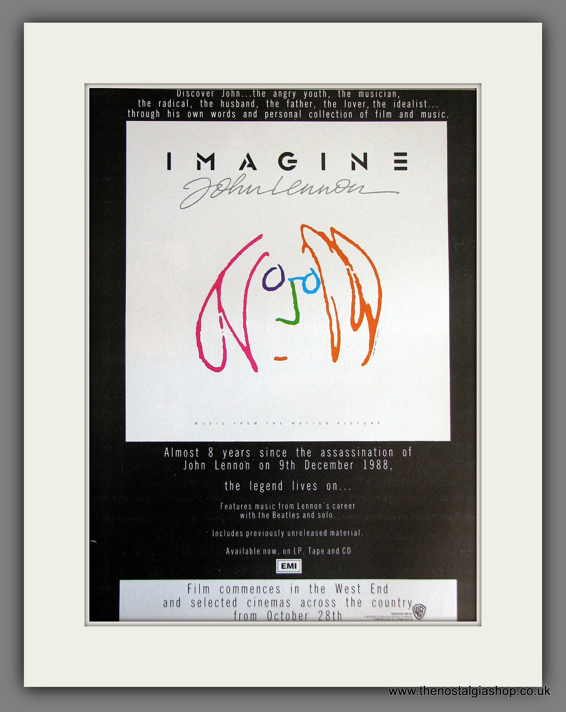 John Lennon Imagine. Vintage Advert. Classic Original Advert 1988. Presented and Supplied in a cream bevel cut mount with backing card and display bag. Ready to fit in 14 x 11 inch frame. Want it framing? If so, buy this then go to Frames Available Category. Click to buy on the suitable frame and we will do the rest. All our adverts, unless clearly stated are Originals from the date shown. They make excellent pieces of wall art and stunning gifts. Many are rare and hard to find and once sold, may not be replaced. Remember you are buying a piece of history. Website watermark is not on original.