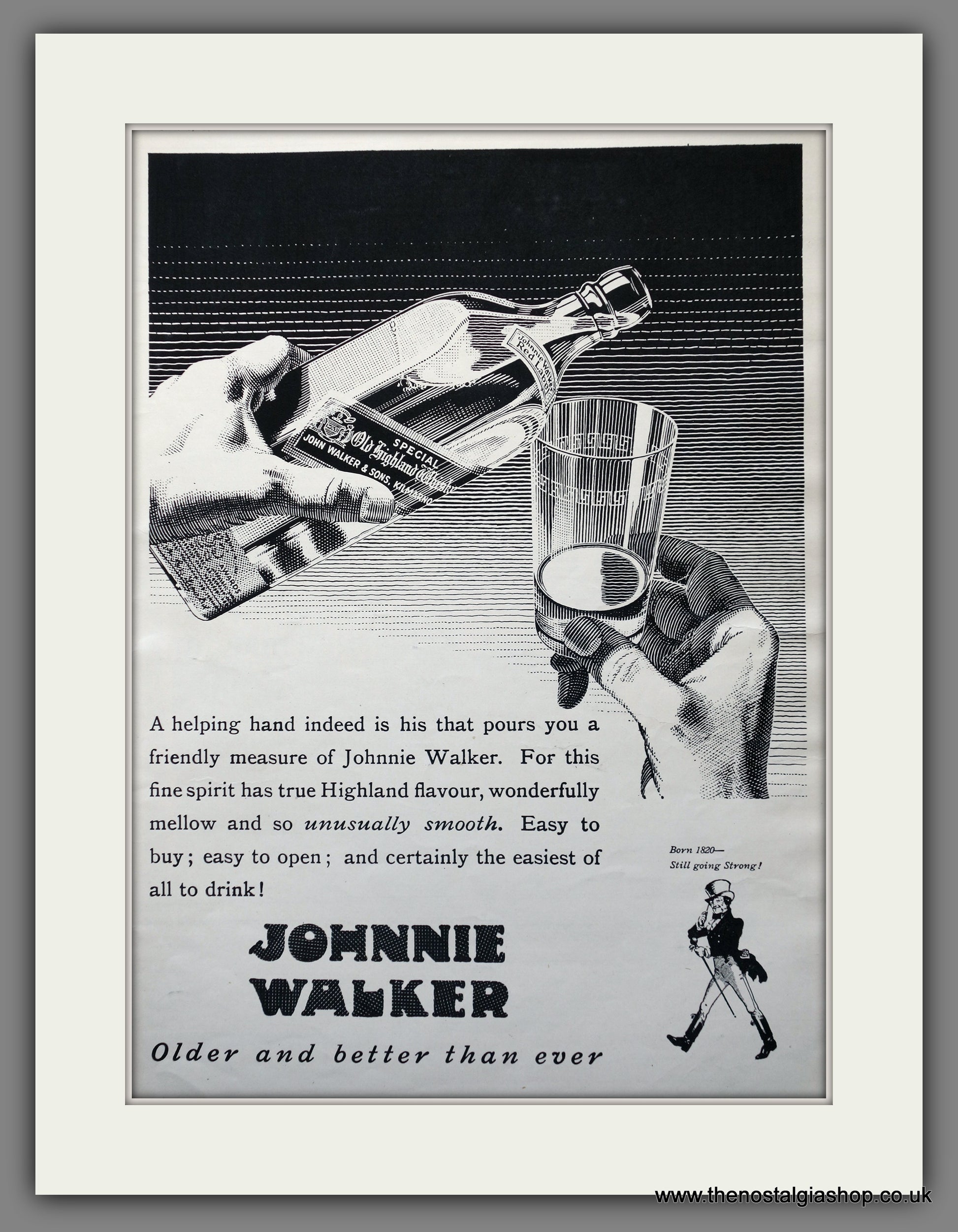 Johnny Walker Whisky. Vintage Advert. This is a large classic Original Advert 1935. Presented and Supplied in a cream bevel cut mount with backing card and clear bag. Ready to fit in 18 x 14 inch frame. The mounted advert will be posted via courier and well packed - protected with a sheet of hardboard to keep it rigid. Any questions or inquiries, please get in touch, we are here to help! All our adverts, unless clearly stated are Originals from the date shown. They make excellent pieces of wall art and stunning gifts. Many are rare and hard to find and once sold, may not be replaced. Remember you are buying a piece of history. Website watermark is not on original. Vintage drink adverts. Drink Adverts..