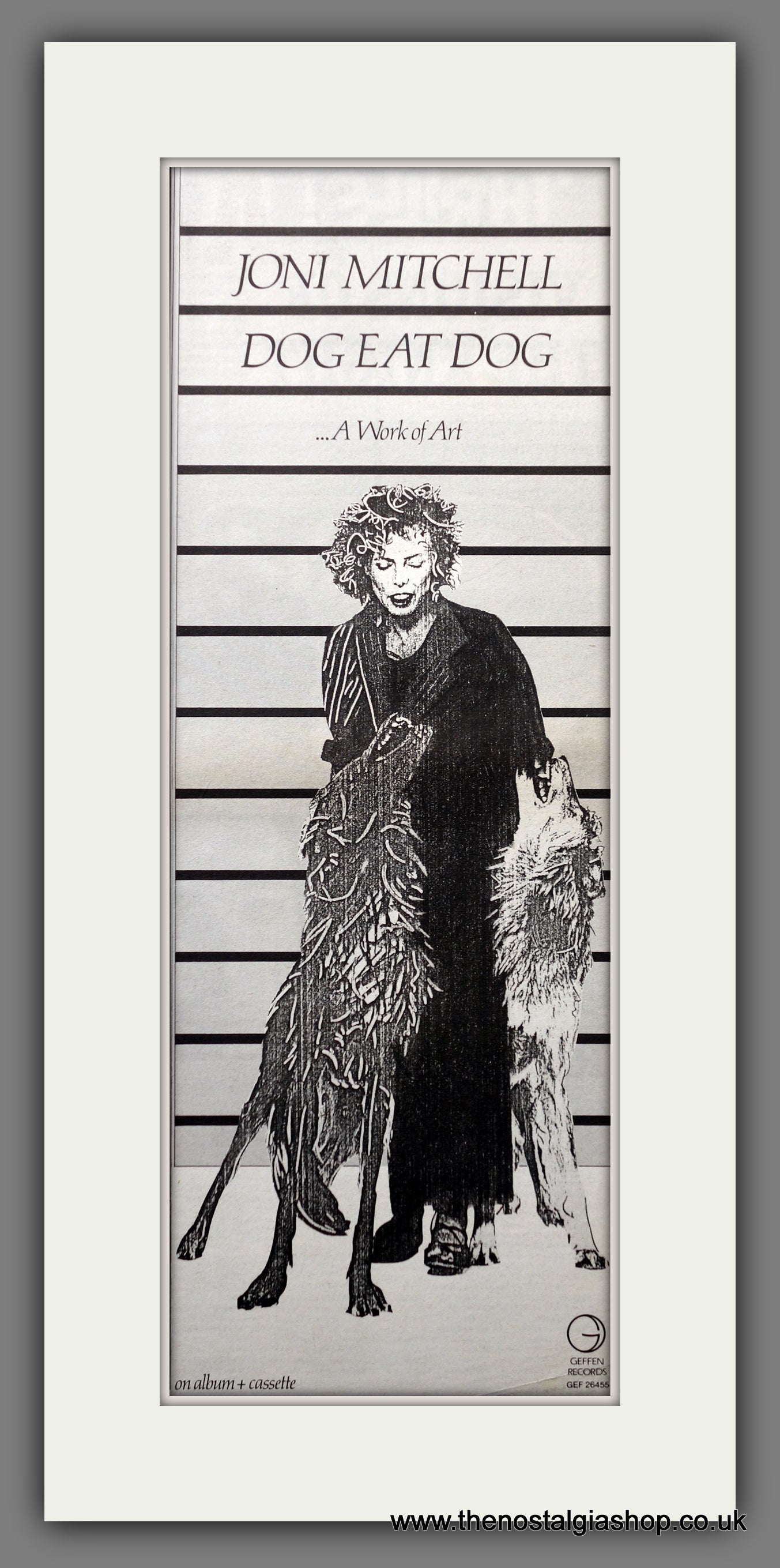 Joni Mitchell Dog Eat Dog. This is a large Original Vintage Advert 1985. Presented and Supplied in a cream, bevel cut mount with backing card and clear bag. Ready to fit in 20 x 10 inch frame. The mounted advert will be posted via courier and well packed - protected with a sheet of hardboard to keep it rigid. Any questions or inquiries, please get in touch, we are here to help! All our adverts, unless clearly stated are Originals from the date shown. They make excellent pieces of wall art and stunning gifts. Many are rare and hard to find and once sold, may not be replaced. Remember you are buying a piece of history. Website watermark is not on original.