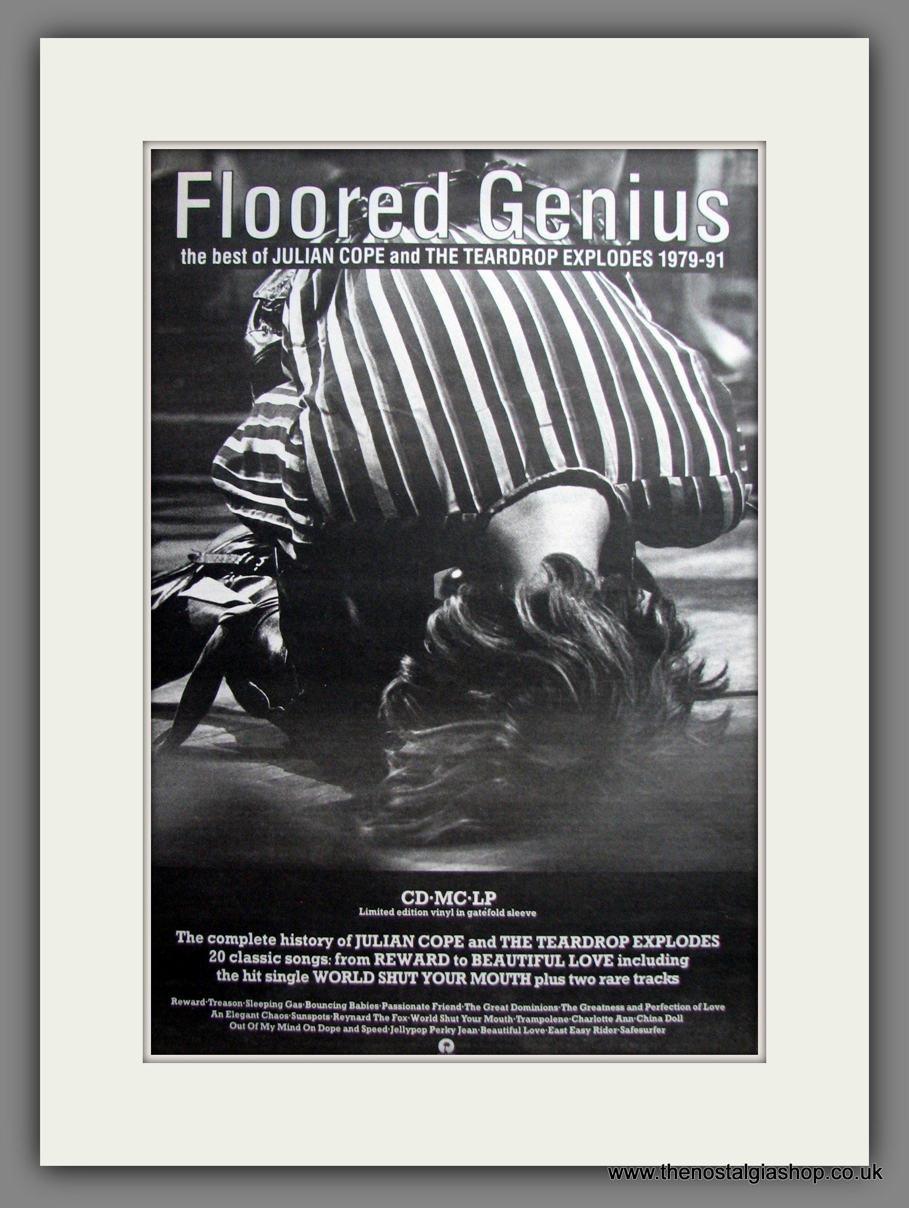 Julian Cope And The Teardrop Explodes, Best Of. Original Advert 1992 (ref AD12446). Presented and supplied in a cream bevel cut mount with backing card and clear bag. Ready to fit in a 20x16 inch frame. The mounted advert will be posted via courier and well packed - protected with a sheet of hardboard to keep it rigid. Any questions or enquiries, please get in touch, we are here to help! All our adverts, unless clearly stated are originals from the date shown. They make excellent pieces of wall art and stunning gifts. Many are rare and hard to find and once sold, may not be replaced. Remember you are buying a piece of history. Website watermark is not on original.