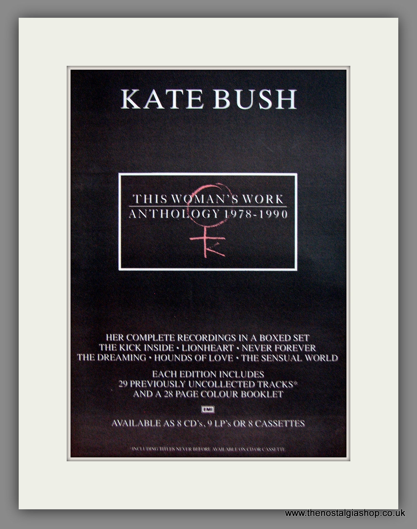 Kate Bush, Anthology, '78-'90. This is a classic Original Vintage Advert 1990. Presented and Supplied in a cream, bevel cut mount with backing card and clear bag. Ready to fit in 14 x 11 inch frame. The mounted advert will be posted via courier and well packed - protected with a sheet of hardboard to keep it rigid. Any questions or inquiries, please get in touch, we are here to help! All our adverts, unless clearly stated are Originals from the date shown. They make excellent pieces of wall art and stunning gifts. Many are rare and hard to find and once sold, may not be replaced. Remember you are buying a piece of history. Website watermark is not on original.