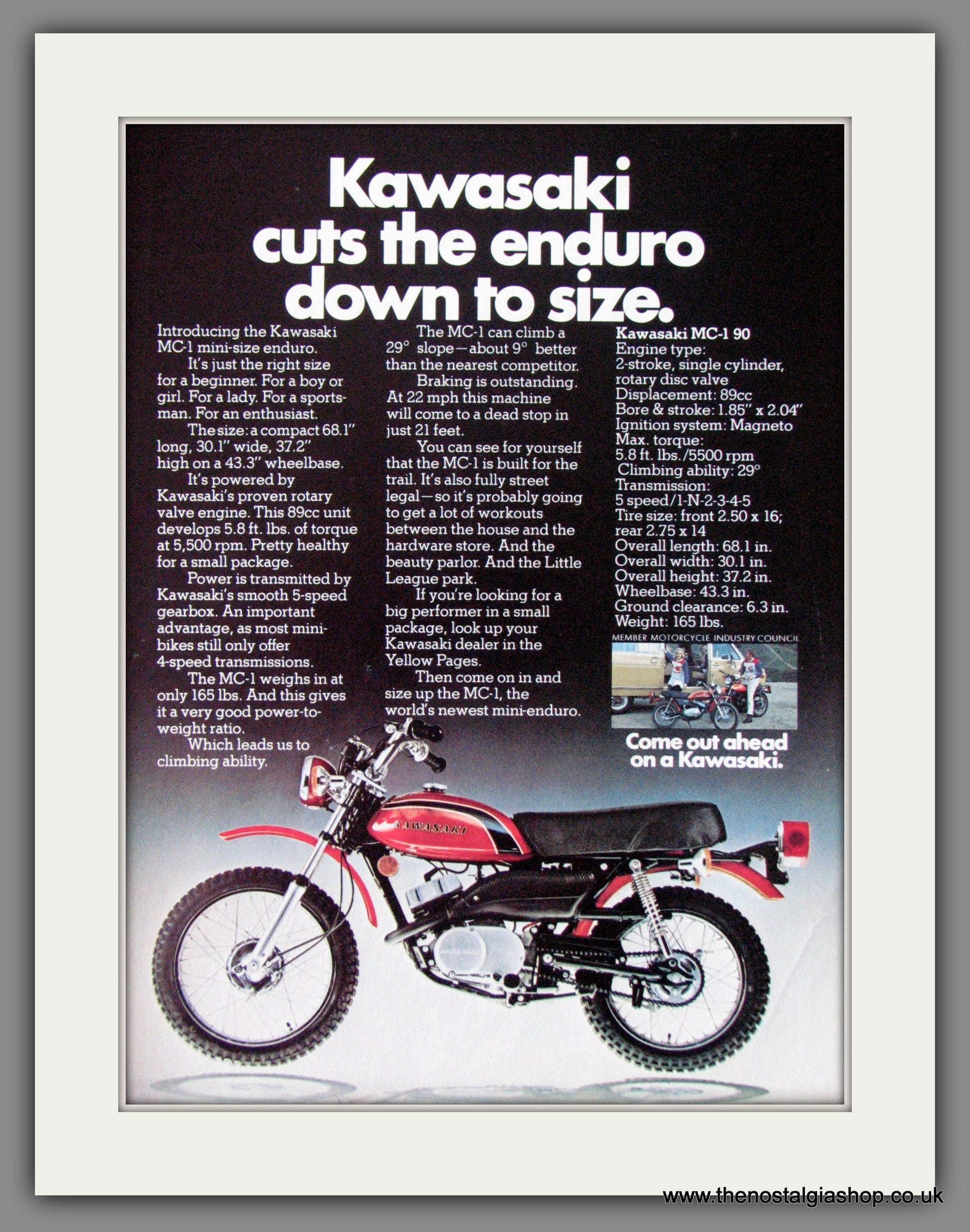 Kawasaki Motorcycles, Kawasaki MC-1 90. Classic Original Vintage Advert 1973. Presented and Supplied in cream bevel cut mount with backing card and clear bag. Ready to fit in 14 x 11 inch frame. Want it framing? If so, buy this then go to Frames Available Category. Click to buy on the suitable frame and we will do the rest. All our adverts, unless clearly stated are Originals from the date shown. They make excellent pieces of wall art and stunning gifts. Many are rare and hard to find and once sold, may not be replaced. Remember you are buying a piece of history. Website watermark is not on original. Japanese Motorcycles.