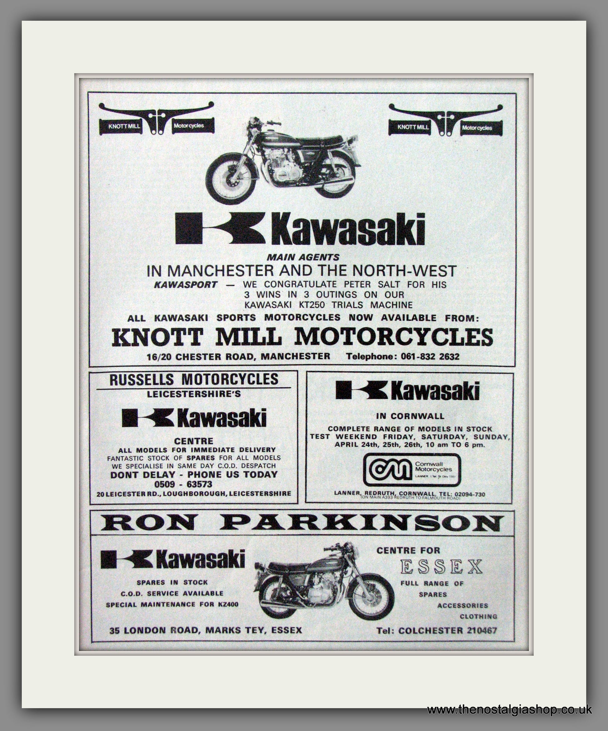 Kawasaki Motorcycle Dealerships. Classic Original Vintage Advert 1975. Presented in cream bevel cut mount with backing card and clear bag. Ready to fit in 14 x 11 inch frame. Want it framing? If so, buy this then go to Frames Available Category. Click to buy on the suitable frame and we will do the rest. All our adverts, unless clearly stated are Originals from the date shown. They make excellent pieces of wall art and stunning gifts. Many are rare and hard to find and once sold, may not be replaced. Remember you are buying a piece of history. Website watermark is not on original. Japanese Motorcycles.