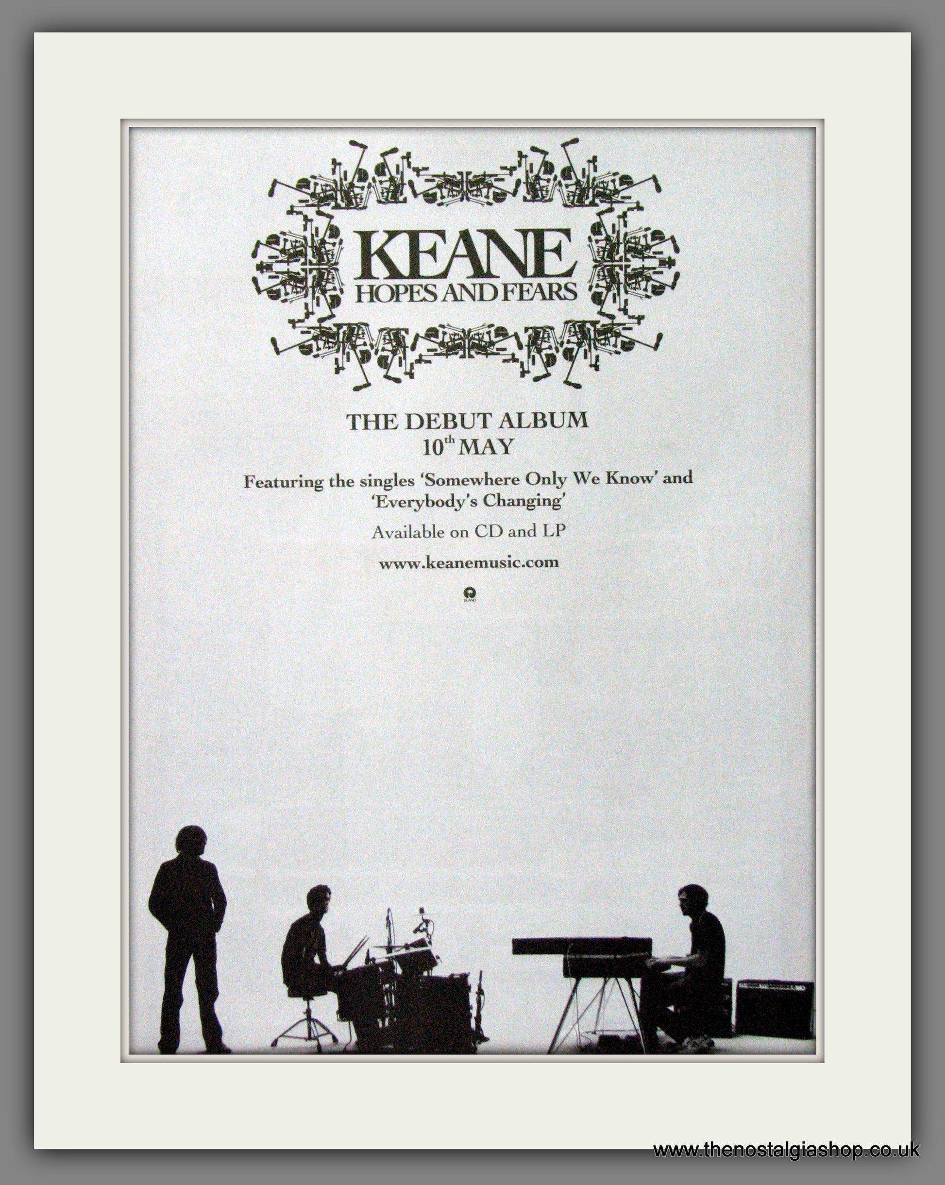 Keane, Debut Album, Hopes And Fears. Classic Original advert 2004. Presented and Supplied in a cream bevel cut mount with backing card and clear bag. Ready to fit in 14 x 11 inch frame. Want it framing? If so, buy this then go to Frames Available Category. Click to buy on the suitable frame and we will do the rest. All our adverts, unless clearly stated are Originals from the date shown. They make excellent pieces of wall art and stunning gifts. Many are rare and hard to find and once sold, may not be replaced. Remember you are buying a piece of history. Website watermark is not on original.