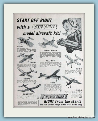 Keilkraft Aircraft Models. Start off right with Keilkraft model aircraft kit! 2 x Classic original adverts 1966 (price is for both adverts) Each is presented in cream bevel cut mount with backing card. Ready to fit in 14 x 11 inch frame. Want them framing? If so, buy these then go to Frames Available Catagory. Click to buy on the suitable frame(s) and we will do the rest. All our adverts, unless clearly stated are Originals from the date shown. They make excellent pieces of wall art and stunning gifts. Many are rare and hard to find and once sold, may not be replaced. Remember you are buying a piece of history. Website watermark is not on original.