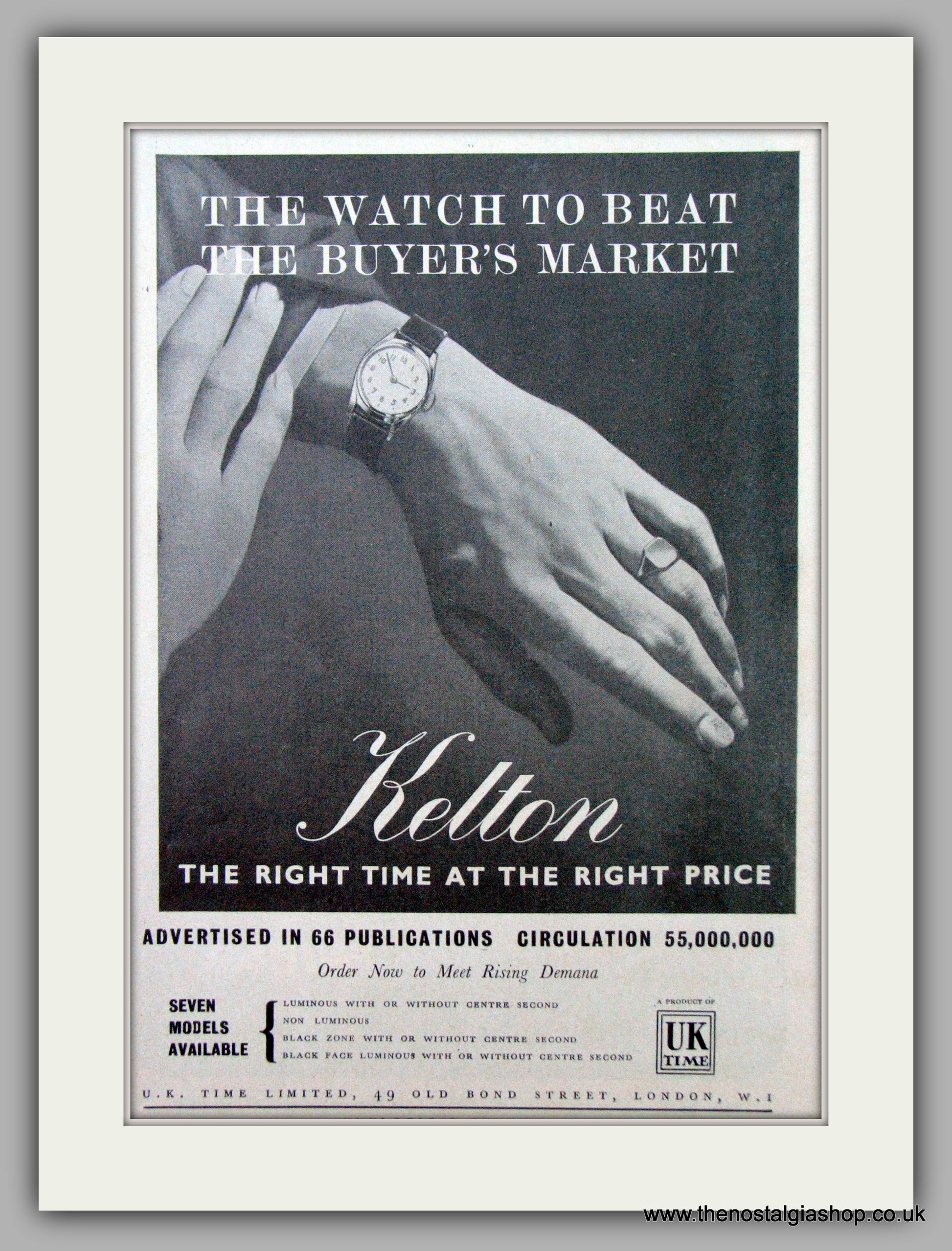Kelton Watches. The watch to beat the buyer's market. Vintage Advert. Original Advert 1948. Presented in cream bevel cut mount with backing card and clear bag. Ready to fit in 14 x 11 inch frame. Want it framing? If so, buy this then go to Frames Available Category. Click to buy on the suitable frame(s) and we will do the rest. All our adverts, unless clearly stated are Originals from the date shown. They make excellent pieces of wall art and stunning gifts. Many are rare and hard to find and once sold, may not be replaced. Remember you are buying a piece of history. Website watermark is not on original.