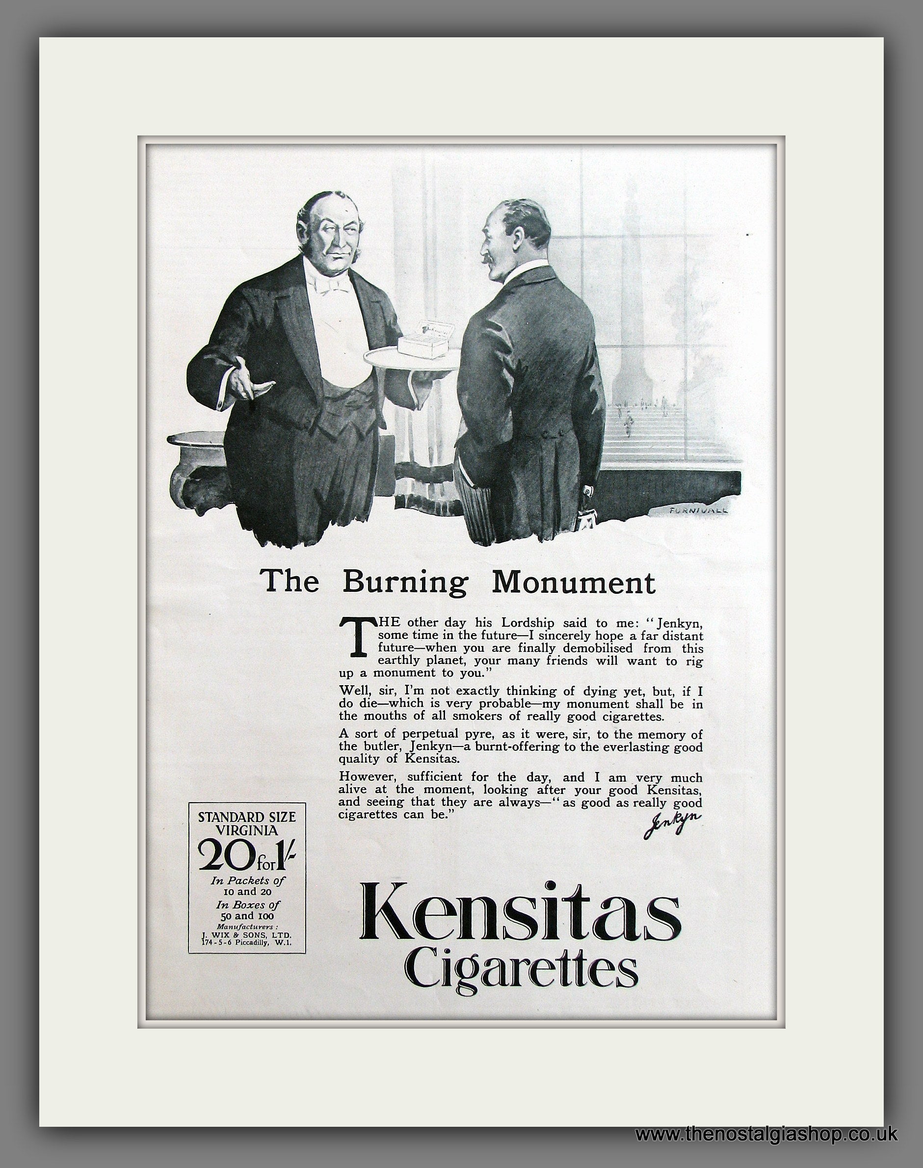 Kensitas Cigarettes. Original Vintage Advert 1923. Presented and Supplied in a 18 x 14 Inch cream mount with backing board and clear bag. Ready for Framing. All our adverts, unless clearly stated are Originals from the date shown. They make excellent pieces of wall art and stunning gifts. Many are rare and hard to find and once sold, may not be replaced. Remember you are buying a piece of history. Website watermarks are not on original. Adverts will be well packed with hardboard to keep rigid in the post.
