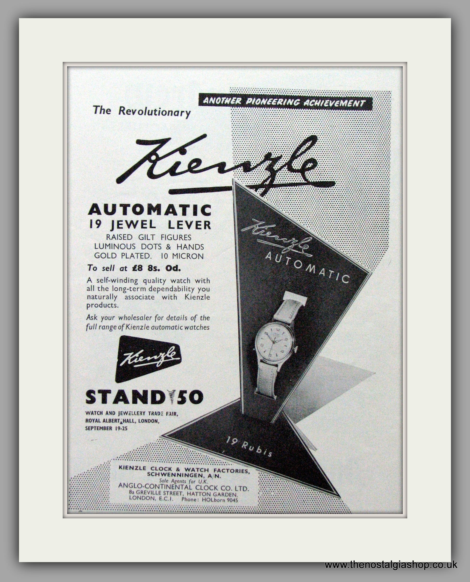 Kienzle Watches. Automatic 19 jewel lever. Vintage Advert. Original Advert 1957. Presented in cream bevel cut mount with backing card and clear bag. Ready to fit in 14 x 11 inch frame. Want it framing? If so, buy this then go to Frames Available Category. Click to buy on the suitable frame(s) and we will do the rest. All our adverts, unless clearly stated are Originals from the date shown. They make excellent pieces of wall art and stunning gifts. Many are rare and hard to find and once sold, may not be replaced. Remember you are buying a piece of history. Website watermark is not on original.