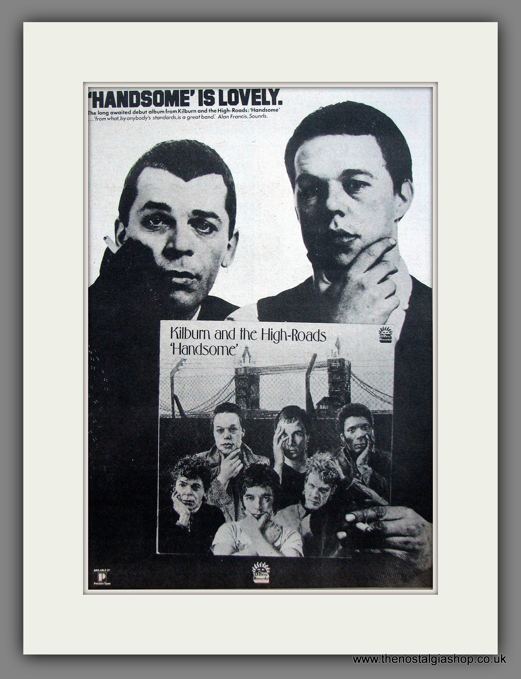 Kilburn And The High Roads. Handsome. Original Advert 1975 (ref AD11954). Presented and supplied in a cream bevel cut mount with backing card and clear bag. Ready to fit in a 20x16 inch frame. The mounted advert will be posted via courier and well packed - protected with a sheet of hardboard to keep it rigid. Any questions or enquiries, please get in touch, we are here to help! All our adverts, unless clearly stated are originals from the date shown. They make excellent pieces of wall art and stunning gifts. Many are rare and hard to find and once sold, may not be replaced. Remember you are buying a piece of history. Website watermark is not on original.