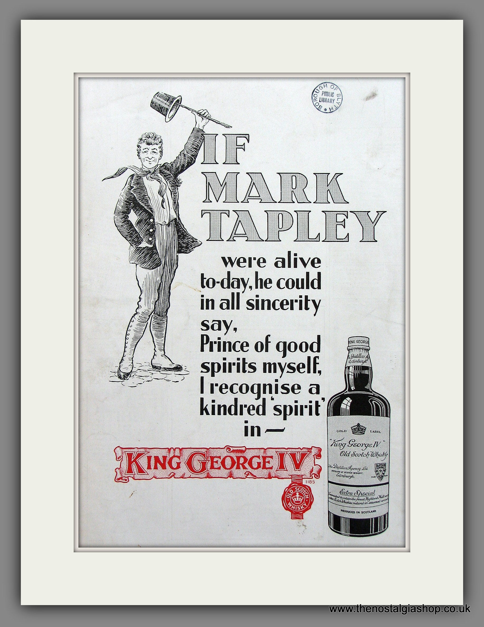 King George IV Old Scotch Whisky. Original Vintage Advert 1931. Presented and Supplied in cream bevel cut mount Size 18 x 14 Inches, with backing card and clear bag. Ready to frame. The mounted advert will be posted via courier and well packed - protected with a sheet of hardboard to keep it rigid. Any questions or inquiries, please get in touch, we are here to help! All our adverts, unless clearly stated are Originals from the date shown. They make excellent pieces of wall art and stunning gifts. Many are rare and hard to find and once sold, may not be replaced. Remember you are buying a piece of history. Website watermark is not on original .