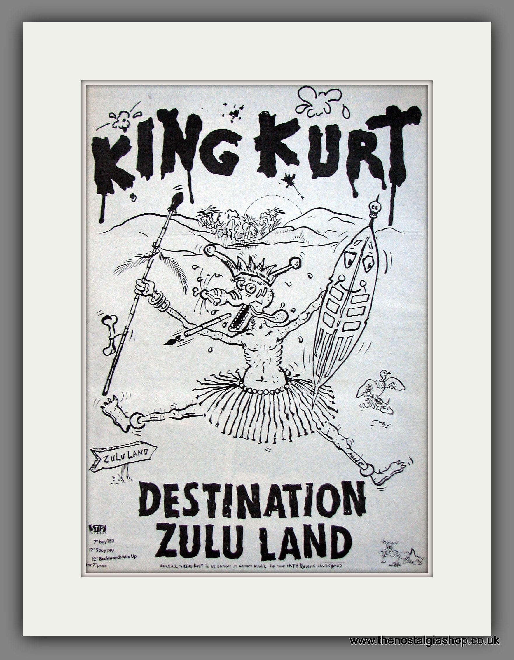 King Kurt, Destination Zulu Land. This is a large classic Original Vintage Advert 1983. Presented and Supplied in a cream, bevel cut mount with backing card and clear bag. Ready to fit in 20 x 16 inch frame. The mounted advert will be posted via courier and well packed - protected with a sheet of hardboard to keep it rigid. Any questions or inquiries, please get in touch, we are here to help! All our adverts, unless clearly stated are Originals from the date shown. They make excellent pieces of wall art and stunning gifts. Many are rare and hard to find and once sold, may not be replaced. Remember you are buying a piece of history. Website watermark is not on original.