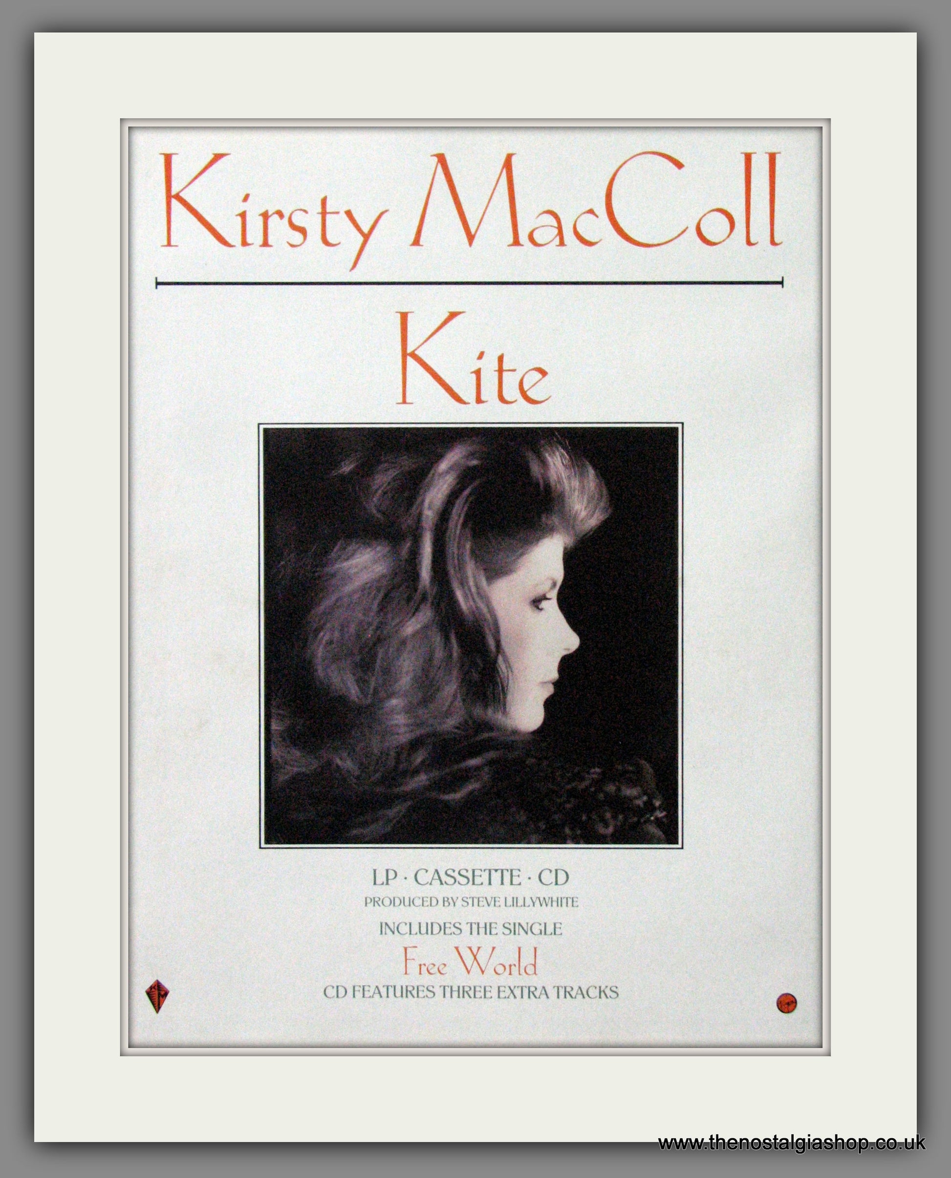 Kirsty MacColl. Kite. Classic Original advert 1989. Presented and Supplied in a cream bevel cut mount with backing card and clear bag. Ready to fit in 14 x 11 inch frame. Want it framing? If so, buy this then go to Frames Available Category. Click to buy on the suitable frame and we will do the rest. All our adverts, unless clearly stated are Originals from the date shown. They make excellent pieces of wall art and stunning gifts. Many are rare and hard to find and once sold, may not be replaced. Remember you are buying a piece of history. Website watermark is not on original.