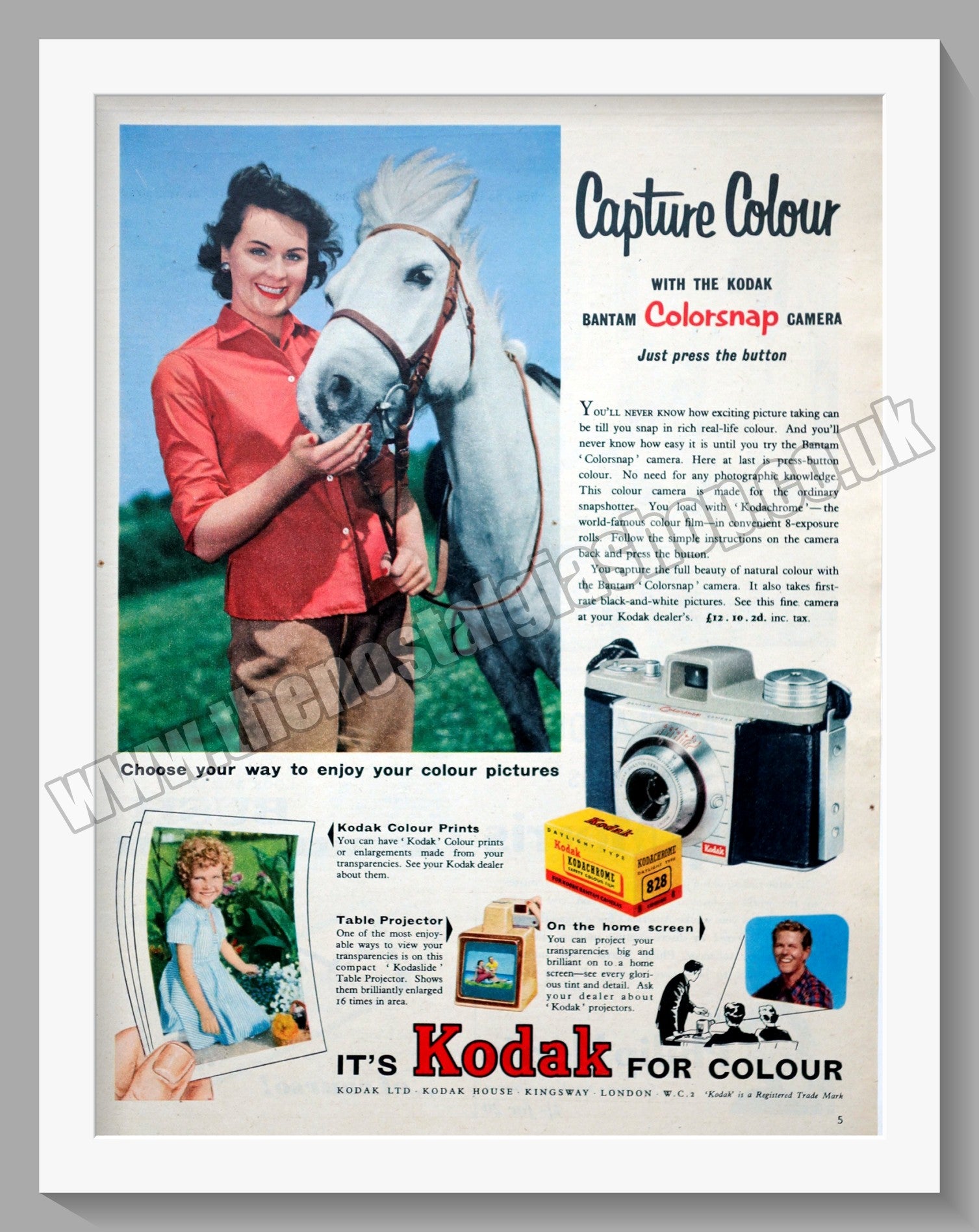 Kodak Bantam Colorsnap Camera. Vintage Advert. Classic Original Advert 1957. Presented and Supplied in a cream bevel cut mount with backing card and clear bag. Ready to fit in 18 x 14 inch frame. Will be well packed with a sheet of hardboard to keep the mounted Advert flat. All our adverts, unless clearly stated are Originals from the date shown. They make excellent pieces of wall art and stunning gifts. Many are rare and hard to find and once sold, may not be replaced. Remember you are buying a piece of history. Website watermark is not on original. Vintage Cameras, Old Cameras.