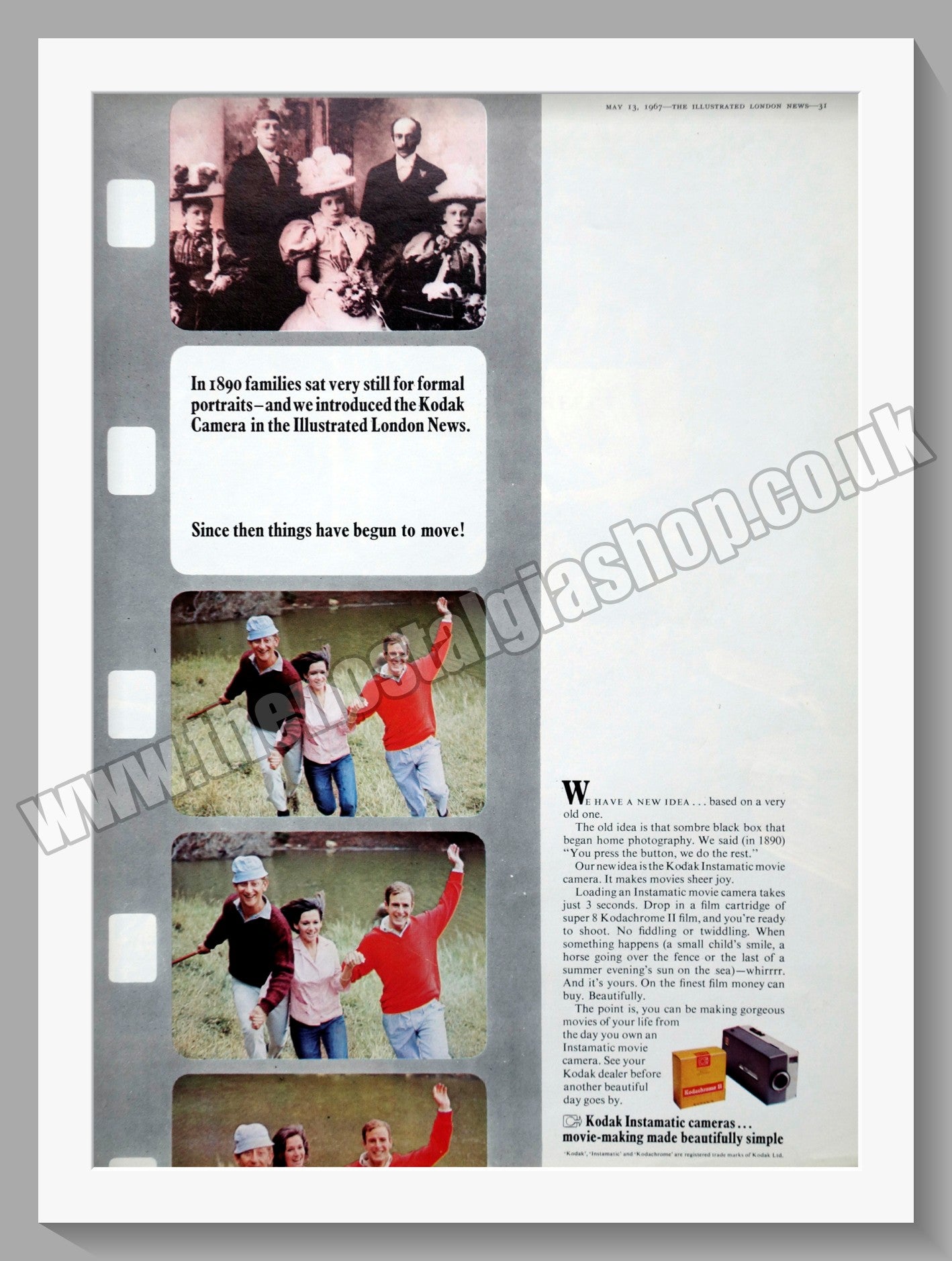 Kodak Instamatic Movie Camera. Vintage Advert. Classic Original Advert 1967. Presented and Supplied in a cream bevel cut mount with backing card and clear bag. Ready to fit in 18 x 14 inch frame. Will be well packed with a sheet of hardboard to keep the mounted Advert flat. All our adverts, unless clearly stated are Originals from the date shown. They make excellent pieces of wall art and stunning gifts. Many are rare and hard to find and once sold, may not be replaced. Remember you are buying a piece of history. Website watermark is not on original. Vintage Cameras, Old Cameras.