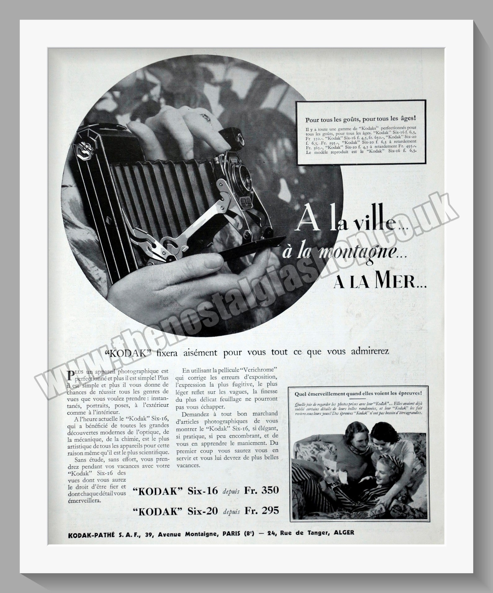 Kodak Six-16 Camera. Vintage Advert. Classic Original Advert 1933. Presented and Supplied in a cream bevel cut mount with backing card and clear bag. Ready to fit in 18 x 14 inch frame. Will be well packed with a sheet of hardboard to keep the mounted Advert flat. All our adverts, unless clearly stated are Originals from the date shown. They make excellent pieces of wall art and stunning gifts. Many are rare and hard to find and once sold, may not be replaced. Remember you are buying a piece of history. Website watermark is not on original. Vintage Cameras, Old Cameras.