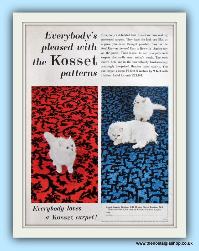 Kosset Carpets. Everybody's pleased with the Kosset patterns. Classic original advert 1961. Presented in a 20 x 16 Inch cream mount with backing board and clear bag. All our adverts, unless clearly stated are Originals from the date shown. They make excellent pieces of wall art and stunning gifts. Many are rare and hard to find and once sold, may not be replaced. Remember you are buying a piece of history. Website watermarks are not on original. Adverts will be well packed with hardboard to keep rigid in the post.