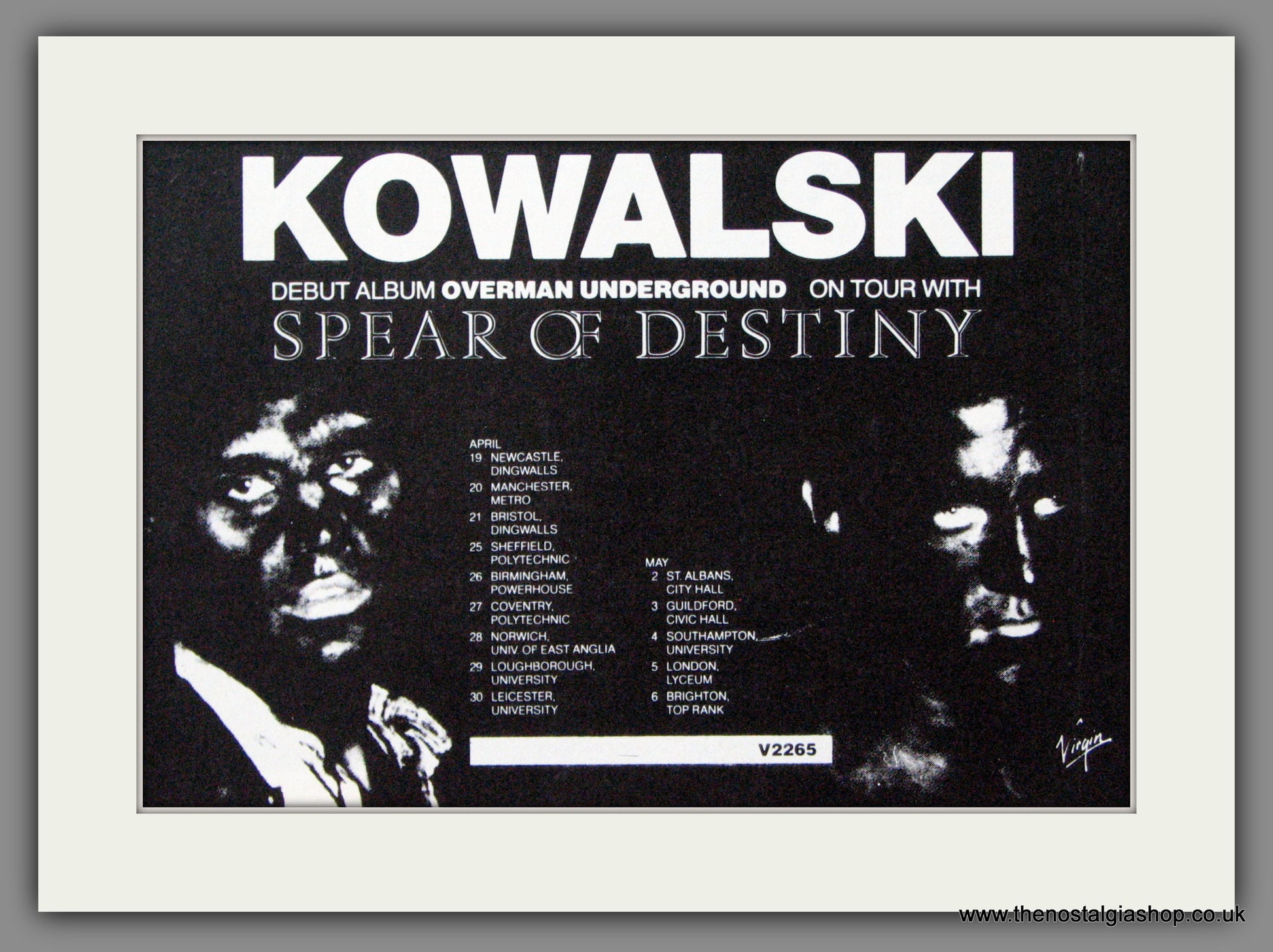 Kowalski, Debut Album Overman Underground. Touring With Spear of Destiny. Classic Original advert 1983. Presented and Supplied in a cream bevel cut mount with backing card and clear bag. Ready to fit in 12 x 10 inch frame. Want it framing? If so, buy this then go to Frames Available Category. Click to buy on the suitable frame and we will do the rest. All our adverts, unless clearly stated are Originals from the date shown. They make excellent pieces of wall art and stunning gifts. Many are rare and hard to find and once sold, may not be replaced. Remember you are buying a piece of history. Website watermark is not on original.