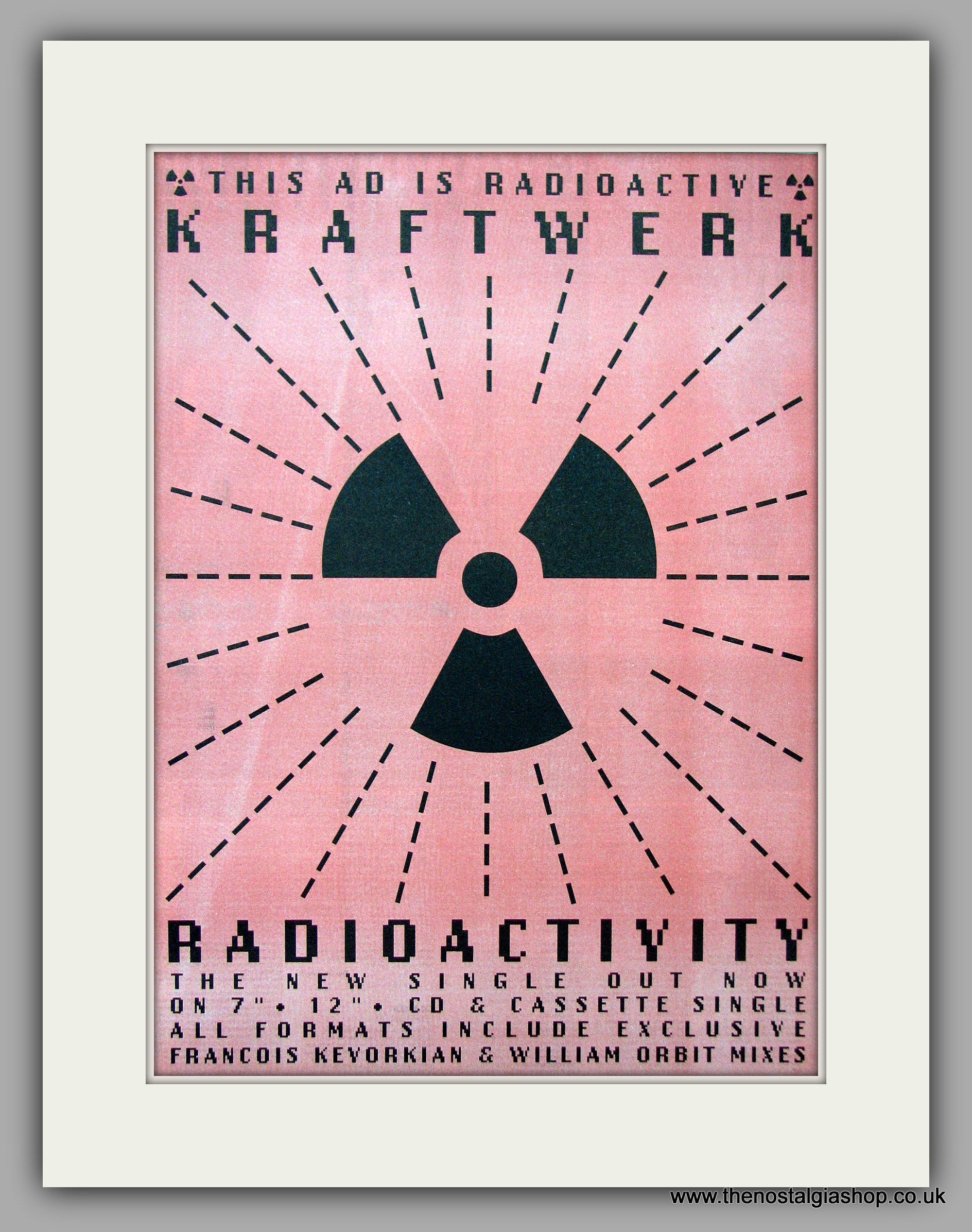 Kraftwerk - Radioactivity. Original Vintage Advert 1991 (ref AD10840). Presented and supplied in a cream bevel cut mount with backing card and clear bag. Ready to fit in a 20x16 inch frame. The mounted advert will be posted via courier and well packed - protected with a sheet of hardboard to keep it rigid. Any questions or enquiries, please get in touch, we are here to help! All our adverts, unless clearly stated are originals from the date shown. They make excellent pieces of wall art and stunning gifts. Many are rare and hard to find and once sold, may not be replaced. Remember you are buying a piece of history. Website watermark is not on original.