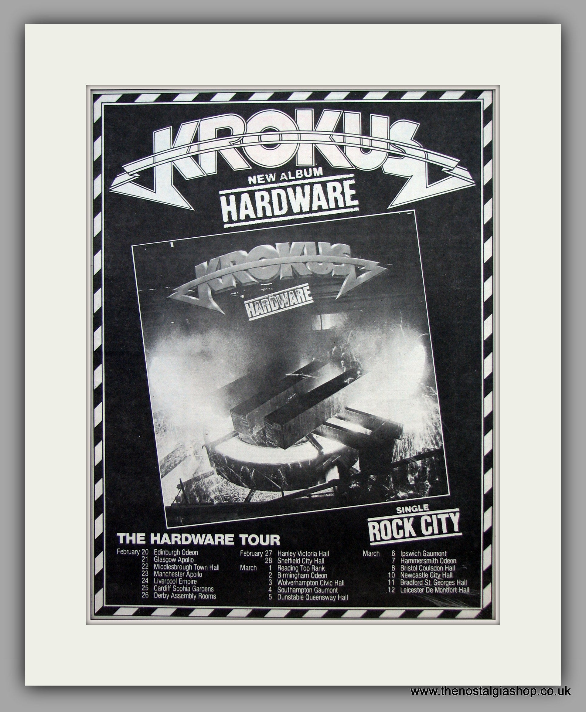 Krokus Hardware, Also UK Tour Dates. Original Vintage Advert 1981 (ref AD10414). Presented and supplied in a cream bevel cut mount with backing card and clear bag. Ready to fit in a 20x16 inch frame. The mounted advert will be posted via courier and well packed - protected with a sheet of hardboard to keep it rigid. Any questions or enquiries, please get in touch, we are here to help! All our adverts, unless clearly stated are originals from the date shown. They make excellent pieces of wall art and stunning gifts. Many are rare and hard to find and once sold, may not be replaced. Remember you are buying a piece of history. Website watermark is not on original.