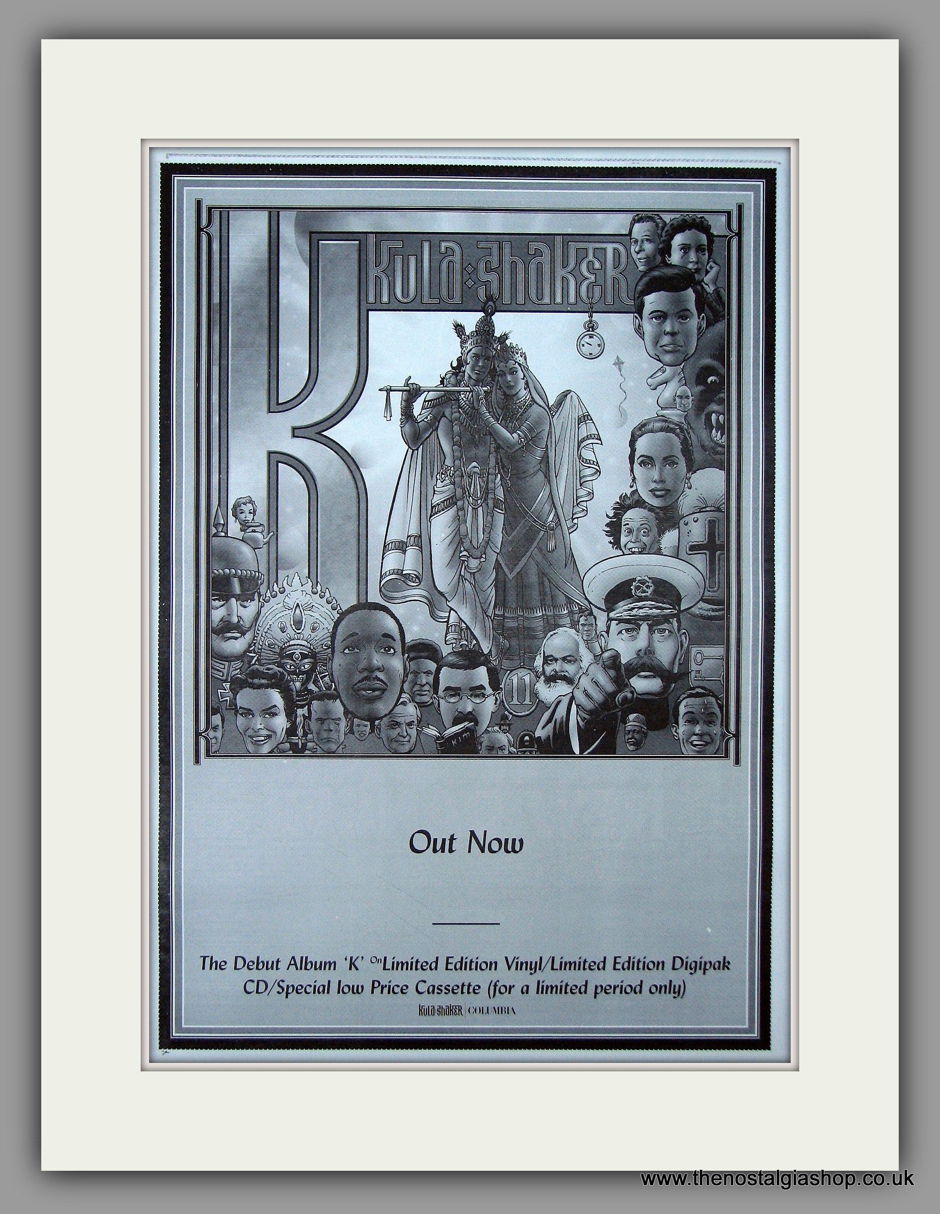 Kula Shaker - K. Original Vintage Advert 1996 (ref AD10852). Presented and supplied in a cream bevel cut mount with backing card and clear bag. Ready to fit in a 20x16 inch frame. The mounted advert will be posted via courier and well packed - protected with a sheet of hardboard to keep it rigid. Any questions or enquiries, please get in touch, we are here to help! All our adverts, unless clearly stated are originals from the date shown. They make excellent pieces of wall art and stunning gifts. Many are rare and hard to find and once sold, may not be replaced. Remember you are buying a piece of history. Website watermark is not on original.