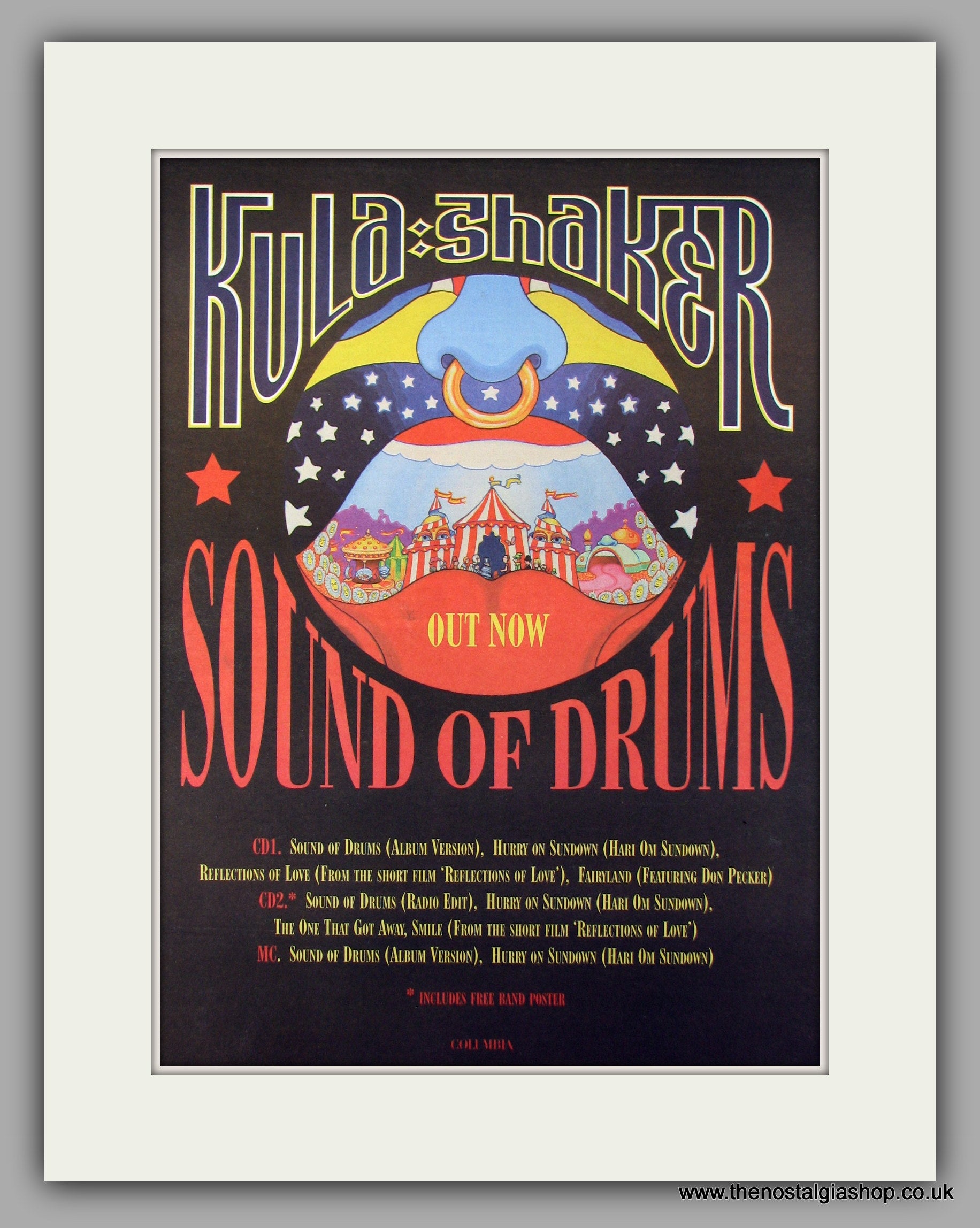 Kula Shaker Sound Of Drums. Original Vintage Advert 1998 (ref AD10120). Presented and supplied in a cream bevel cut mount with backing card and clear bag. Ready to fit in a 20x16 inch frame. The mounted advert will be posted via courier and well packed - protected with a sheet of hardboard to keep it rigid. Any questions or enquiries, please get in touch, we are here to help! All our adverts, unless clearly stated are originals from the date shown. They make excellent pieces of wall art and stunning gifts. Many are rare and hard to find and once sold, may not be replaced. Remember you are buying a piece of history. Website watermark is not on original.