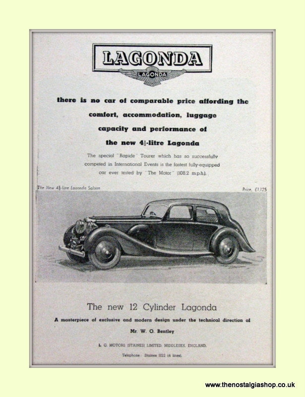 Lagonda The new 12 cylinder Lagonda.Classic original advert 1936.Presented in cream bevel cut mount with backing card and clear bag. Ready to fit in 14 x 11 inch frame. Want it framing? If so, buy this then go to Frames Available Category. Click to buy on the suitable frames and we will do the rest. All our adverts, unless clearly stated are Originals from the date shown, and NOT modern reproductions. They make excellent pieces of wall art and stunning gifts. Many are rare and hard to find and once sold, may not be replaced. Remember you are buying a piece of history. Website watermark is not on original.