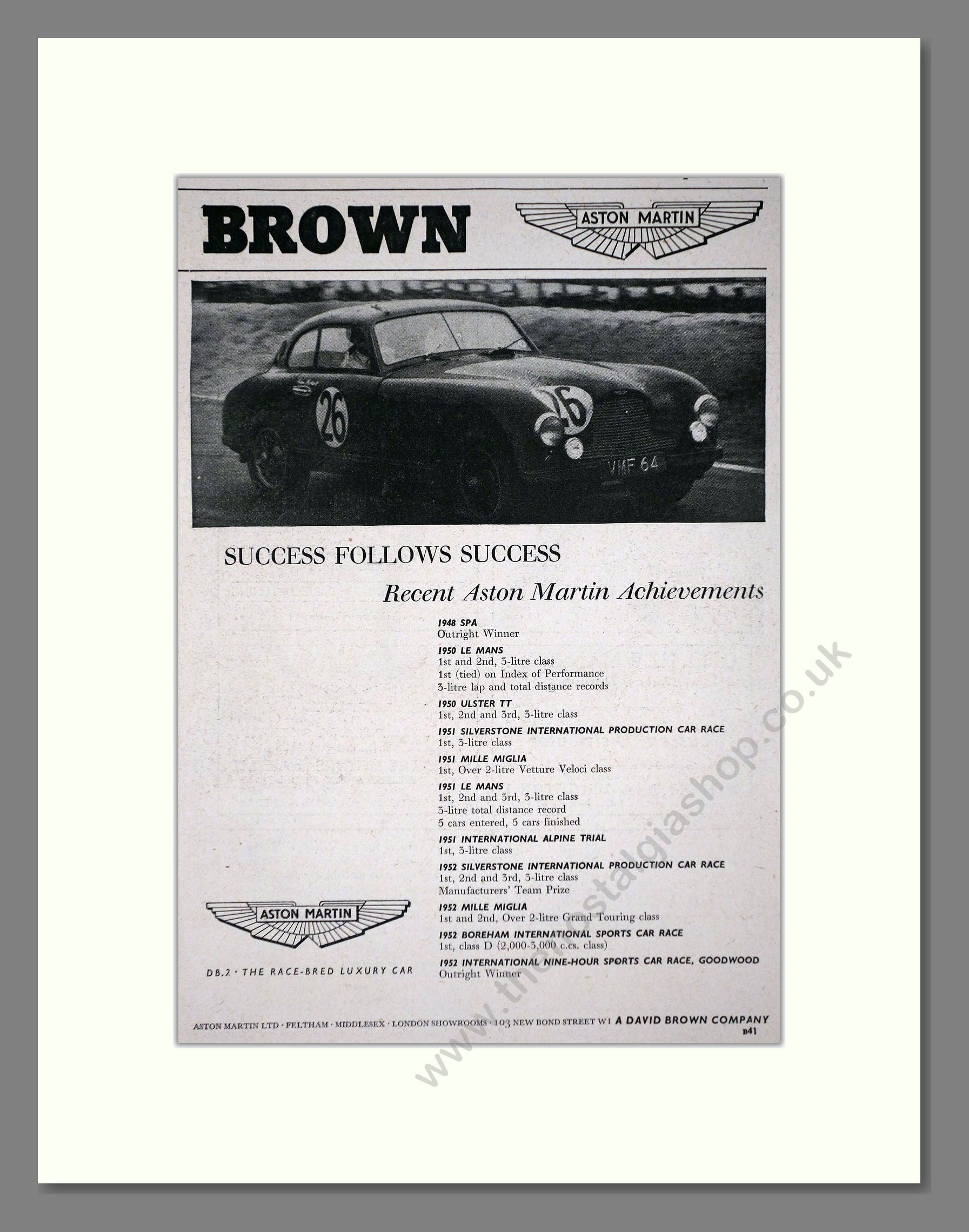 Lagonda - Mark II Saloon (Double Advert). Vintage Advert. This is a classic original advert from 1952. Presented and supplied in a cream bevel cut mount with backing card and clear bag. Ready to fit in a 14 x 11 inches frame. The mounted advert will be posted via courier and well packed - protected with a sheet of hardboard to keep it rigid. Any questions or enquiries, please get in touch, we are here to help! All our adverts, unless clearly stated are originals from the date shown. They make excellent pieces of wall art and stunning gifts. Many are rare and hard to find and once sold, may not be replaced. Remember you are buying a piece of history. Website watermark is not on original. Double Advert presented in 2x mounts