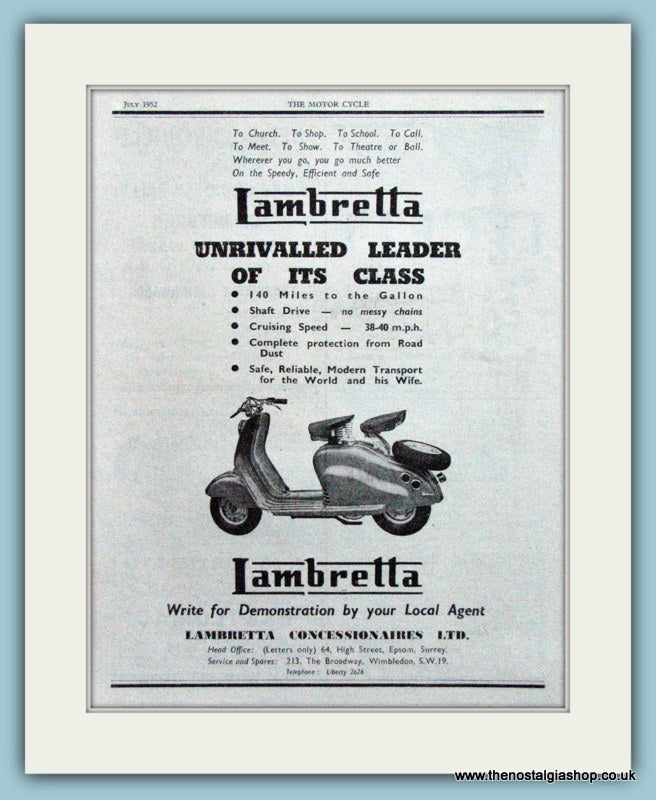 Lambretta Scooter. Unrivalled leader of its class. Classic original Scooter ad 1952. Presented in cream bevel cut mount with backing card and clear bag. Ready to fit in 14 x 11 inch frame. Want it framing? If so, buy this then go to Frames Available Category. Click to buy on the suitable frame and we will do the rest. All our adverts, unless clearly stated are Originals from the date shown They make excellent pieces of wall art and stunning gifts. Many are rare and hard to find and once sold, may not be replaced. Remember you are buying a piece of history. Website watermark is not on original.
