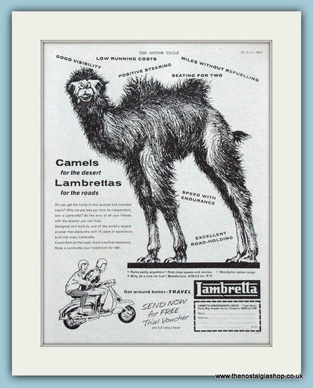 Lambretta! Camels for the desert, Lambrettas for the roads. Classic Original Scooter Advert 1961. Presented in cream bevel cut mount with backing card and clear bag. Ready to fit in 14 x 11 inch frame. Want it framing? If so, buy this then go to Frames Available Category. Click to buy on the suitable frame and we will do the rest. All our adverts, unless clearly stated are Originals from the date shown They make excellent pieces of wall art and stunning gifts. Many are rare and hard to find and once sold, may not be replaced. Remember you are buying a piece of history. Website watermark is not on original.