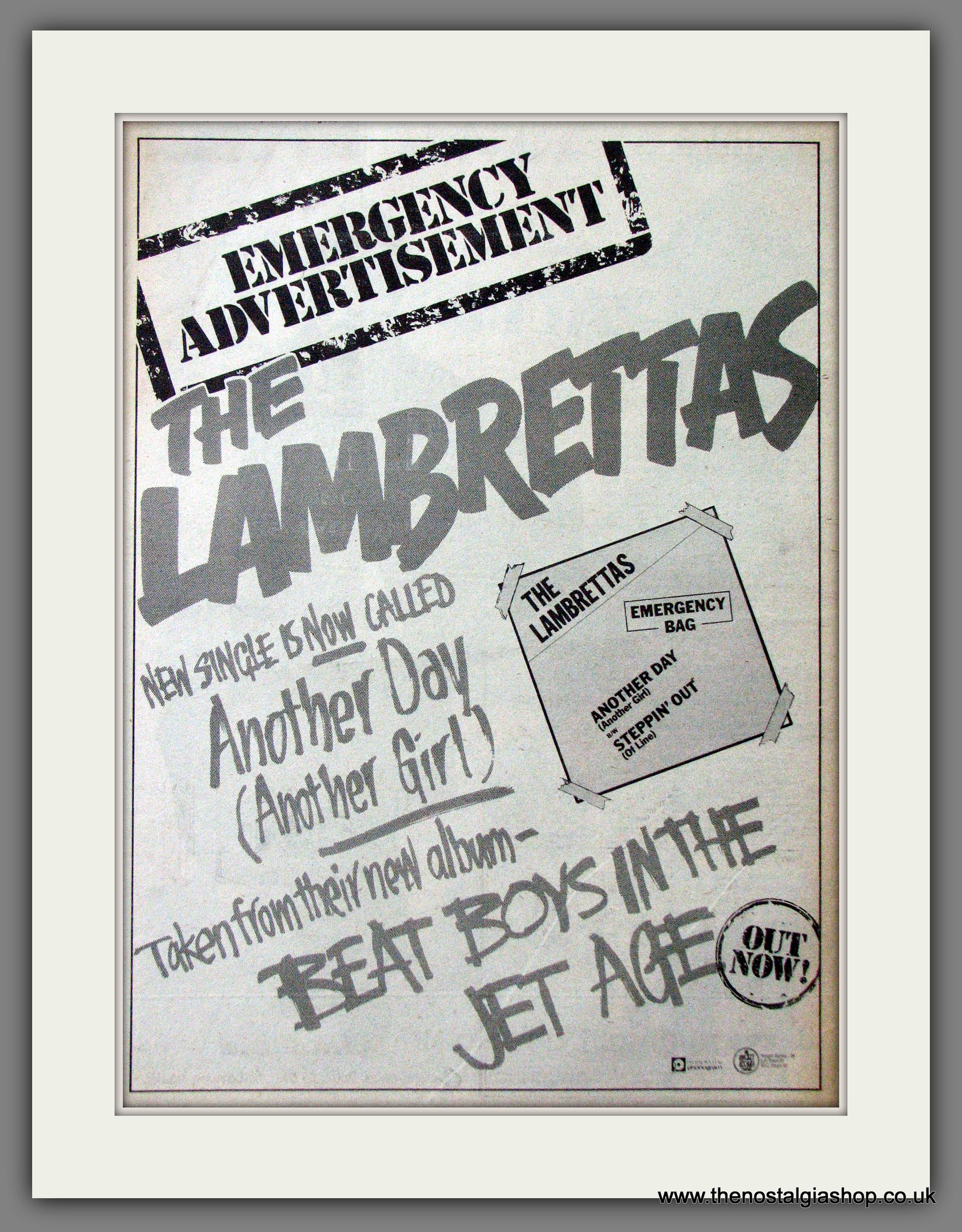 Lambrettas (The) Another Day (Another Girl). Original Advert 1980 (ref AD12741). Presented and supplied in a cream bevel cut mount with backing card and clear bag. Ready to fit in a 20x16 inch frame. The mounted advert will be posted via courier and well packed - protected with a sheet of hardboard to keep it rigid. Any questions or enquiries, please get in touch, we are here to help! All our adverts, unless clearly stated are originals from the date shown. They make excellent pieces of wall art and stunning gifts. Many are rare and hard to find and once sold, may not be replaced. Remember you are buying a piece of history. Website watermark is not on original.