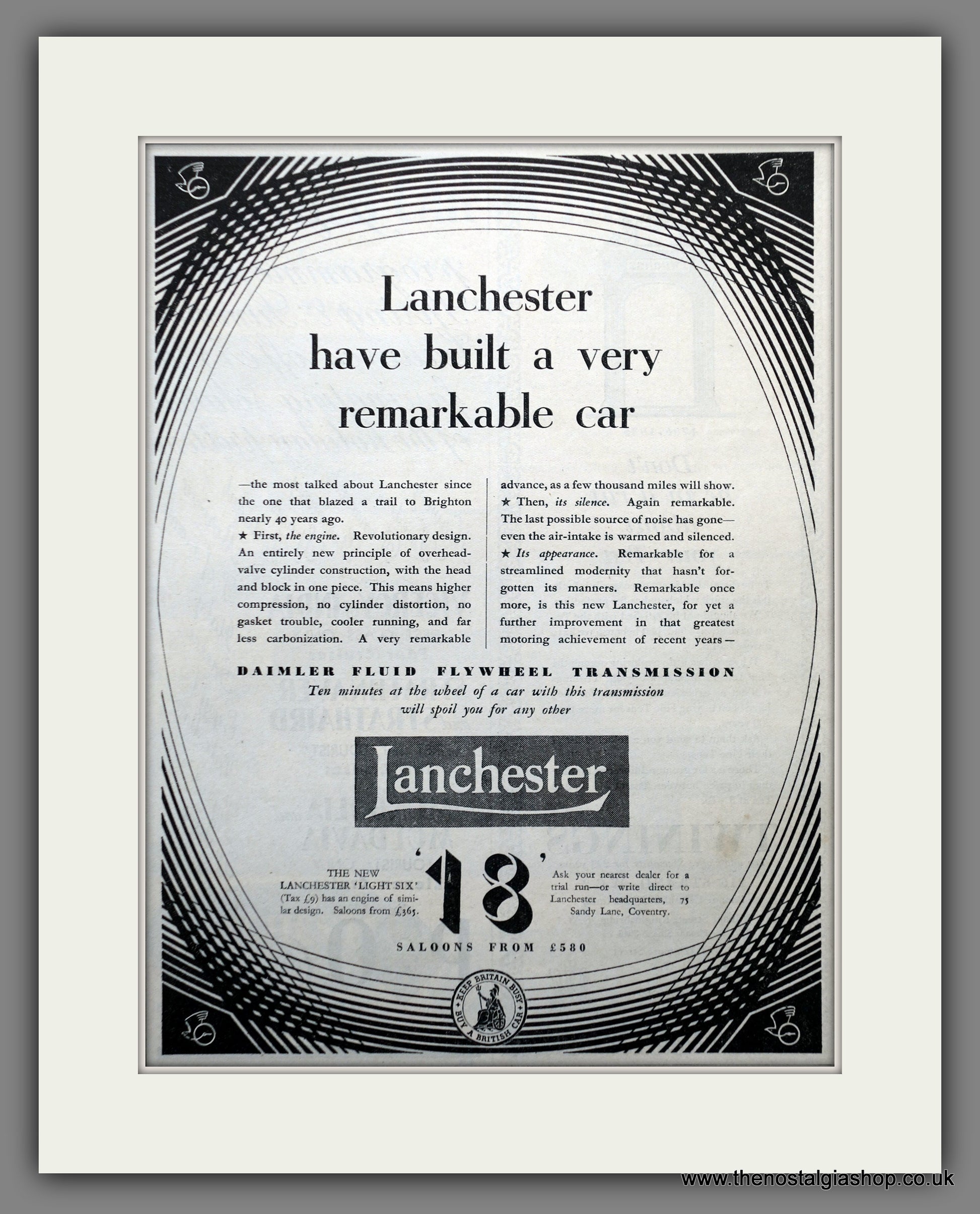 Lanchester Motor Co. Ltd. Classic original advert 1935. Presented and Supplied in a cream bevel cut mount with backing card and clear bag. Ready to fit in 14 x 11 inch frame. All our adverts, unless clearly stated are Originals from the date shown They make excellent pieces of wall art and stunning gifts. Many are rare and hard to find and once sold, may not be replaced. Remember you are buying a piece of history. Website watermark is not on original.