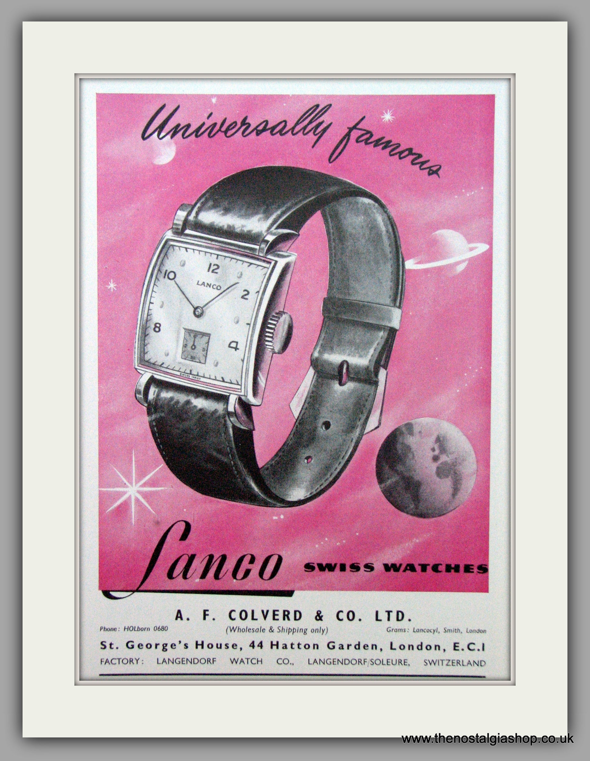 Lanco Watches. Universally Famous. Vintage Advert. Original Advert 1952. Presented in cream bevel cut mount with backing card and clear bag. Ready to fit in 14 x 11 inch frame. Want it framing? If so, buy this then go to Frames Available Category. Click to buy on the suitable frame(s) and we will do the rest. All our adverts, unless clearly stated are Originals from the date shown. They make excellent pieces of wall art and stunning gifts. Many are rare and hard to find and once sold, may not be replaced. Remember you are buying a piece of history. Website watermark is not on original.
