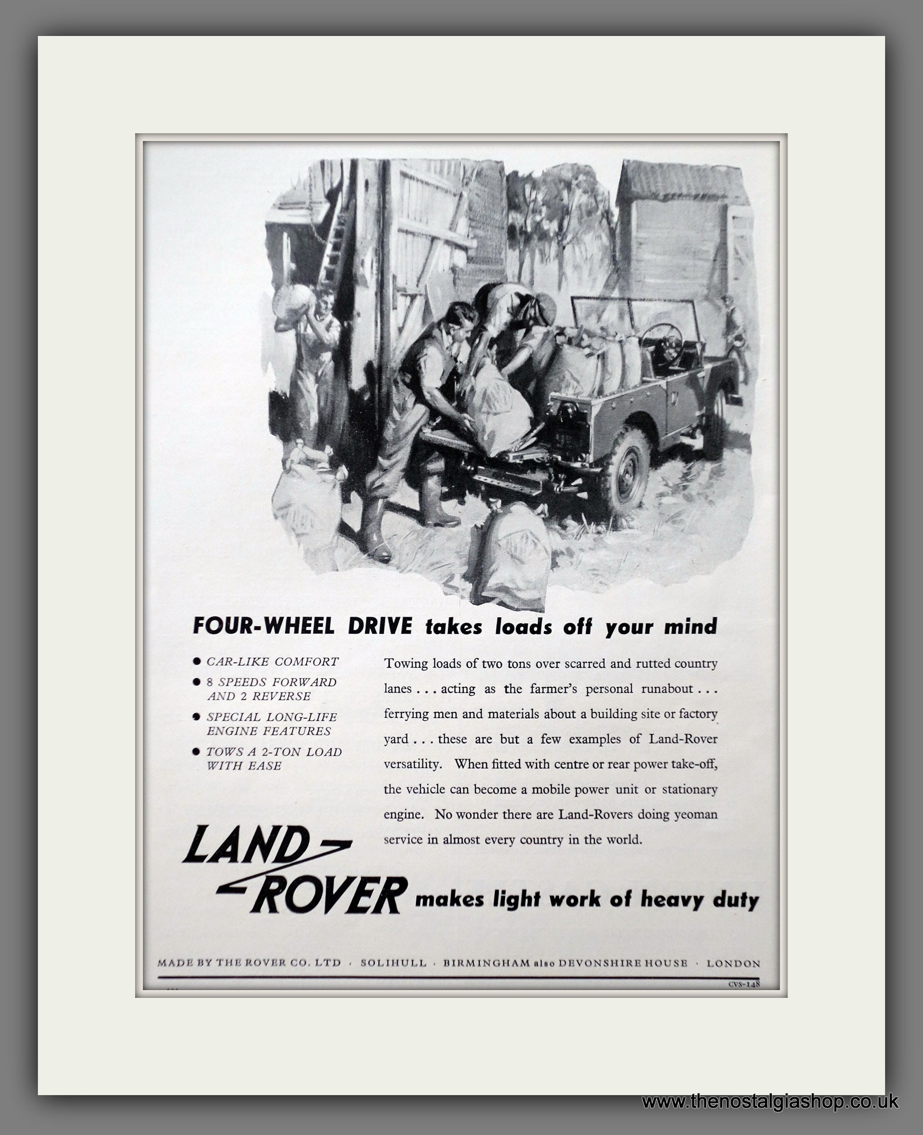 Land-Rover. Vintage Advert. Original Advert 1955. Presented and Supplied in cream bevel cut mount, size 14 x 11 inches with backing card and clear bag. Ready to frame. All our adverts, unless clearly stated are Originals from the date shown They make excellent pieces of wall art and stunning gifts. Many are rare and hard to find and once sold, may not be replaced. Remember you are buying a piece of history. Website watermark is not on original.