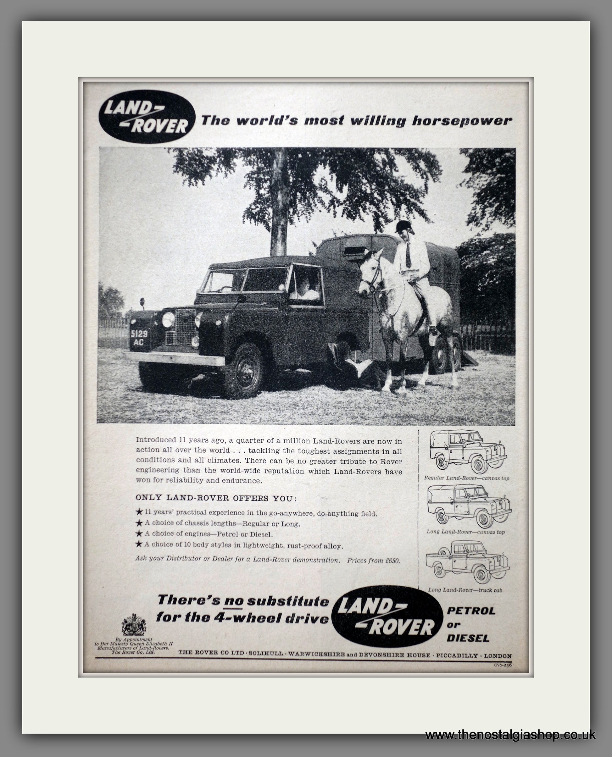 Land-Rover. Vintage Advert. Original Advert 1959. Presented and Supplied in cream bevel cut mount, size 14 x 11 inches with backing card and clear bag. Ready to frame. All our adverts, unless clearly stated are Originals from the date shown They make excellent pieces of wall art and stunning gifts. Many are rare and hard to find and once sold, may not be replaced. Remember you are buying a piece of history. Website watermark is not on original.