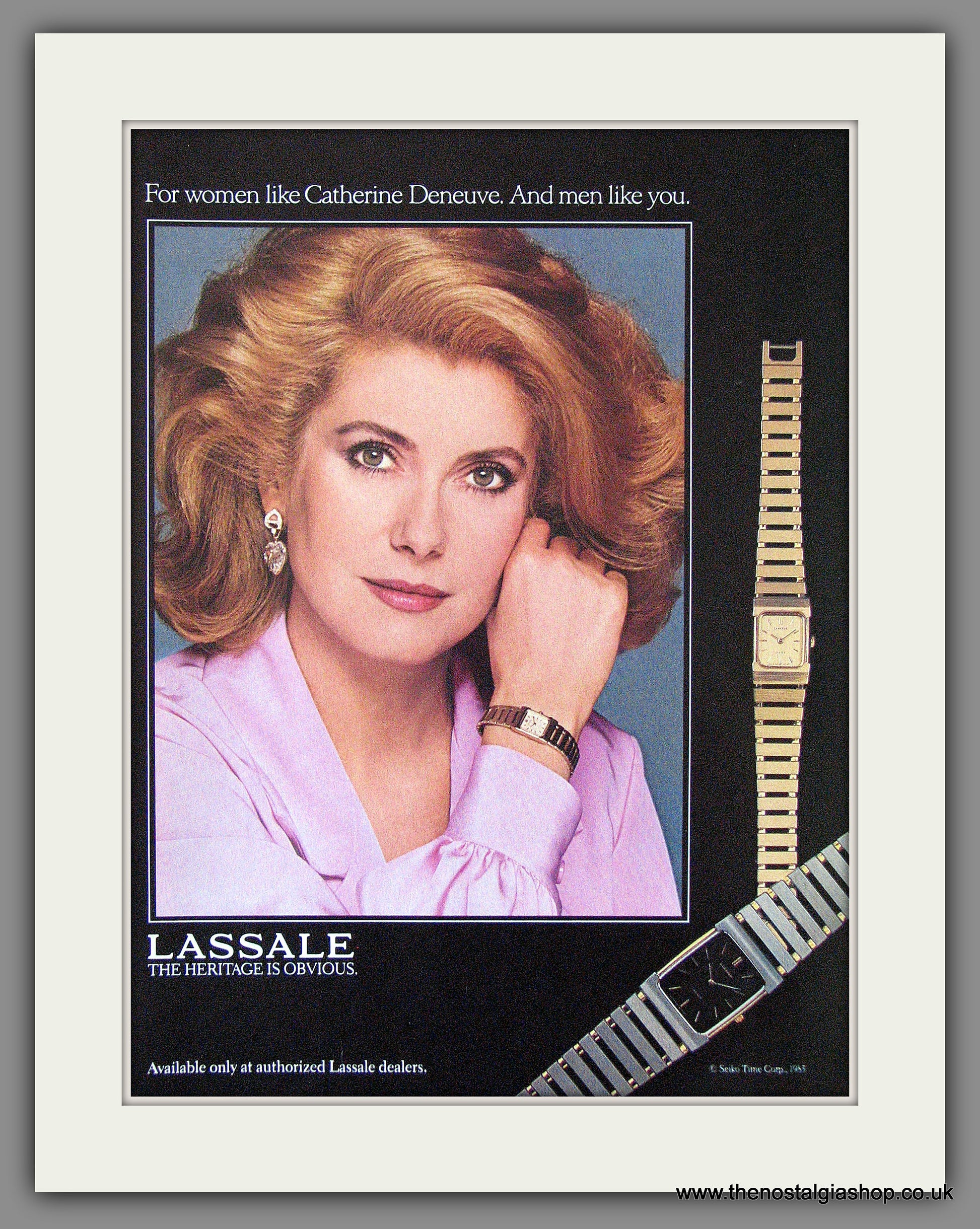 Lassale Watches Featuring Catherine Deneuve. Classic Original Advert 1986. Presented and supplied in a cream bevel cut mount with backing card and clear bag. Ready to fit in 14 x 11 inch frame. Want it framing? If so, buy this then go to Frames Available Category. Click to buy on the suitable frame and we will do the rest. All our adverts, unless clearly stated are Originals from the date shown. They make excellent pieces of wall art and stunning gifts. Many are rare and hard to find and once sold, may not be replaced. Remember you are buying a piece of history. Website watermark is not on original.