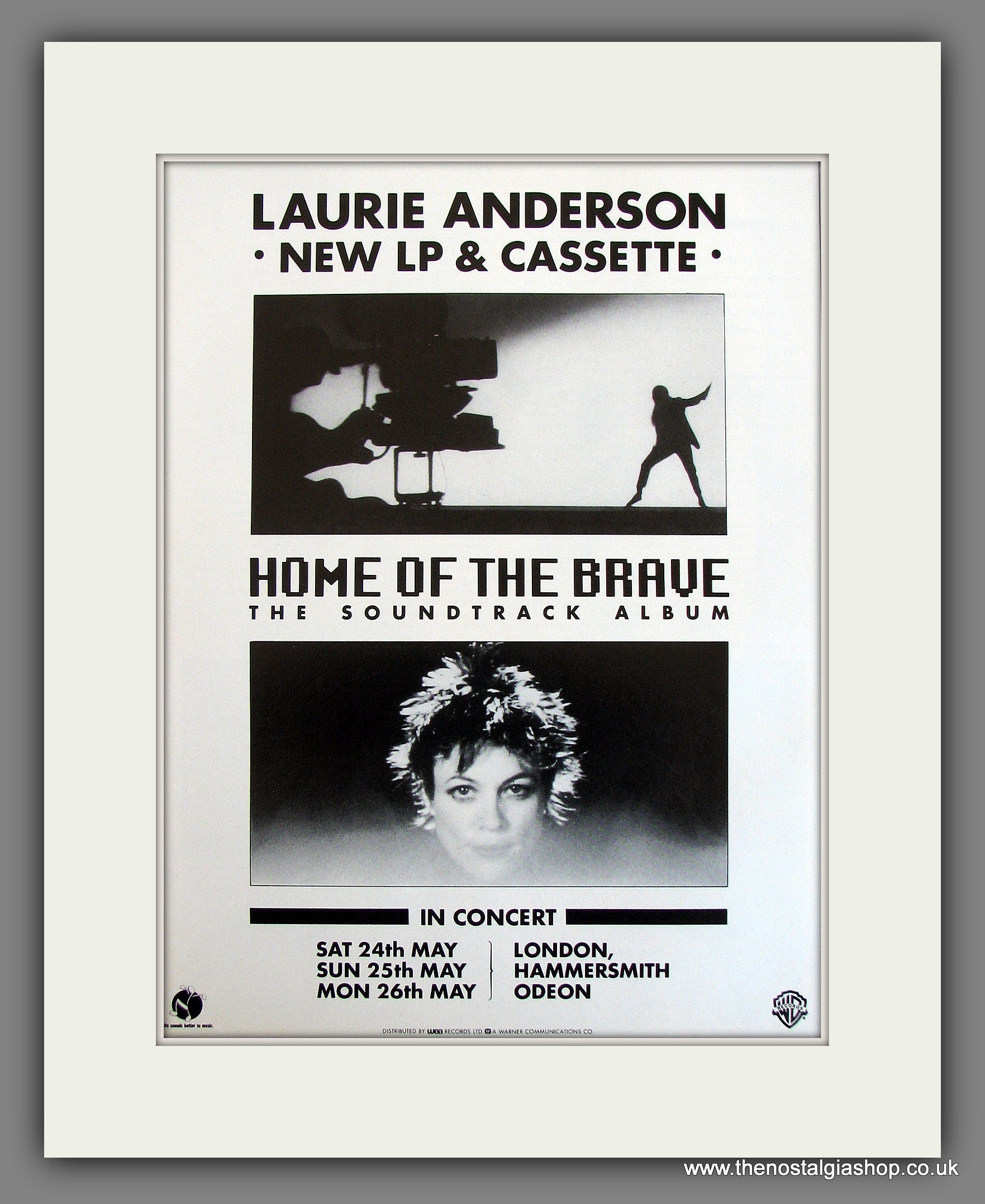 Laurie Anderson Home Of The Brave. Classic Original advert 1986. Presented and supplied in a cream bevel cut mount with backing card and clear bag. Ready to fit in 14 x 11 inch frame. The mounted advert will be posted via courier and well packed - protected with a sheet of hardboard to keep it rigid. Any questions or inquiries, please get in touch, we are here to help! All our adverts, unless clearly stated are Originals from the date shown. They make excellent pieces of wall art and stunning gifts. Many are rare and hard to find and once sold, may not be replaced. Remember you are buying a piece of history. Website watermark is not on original.