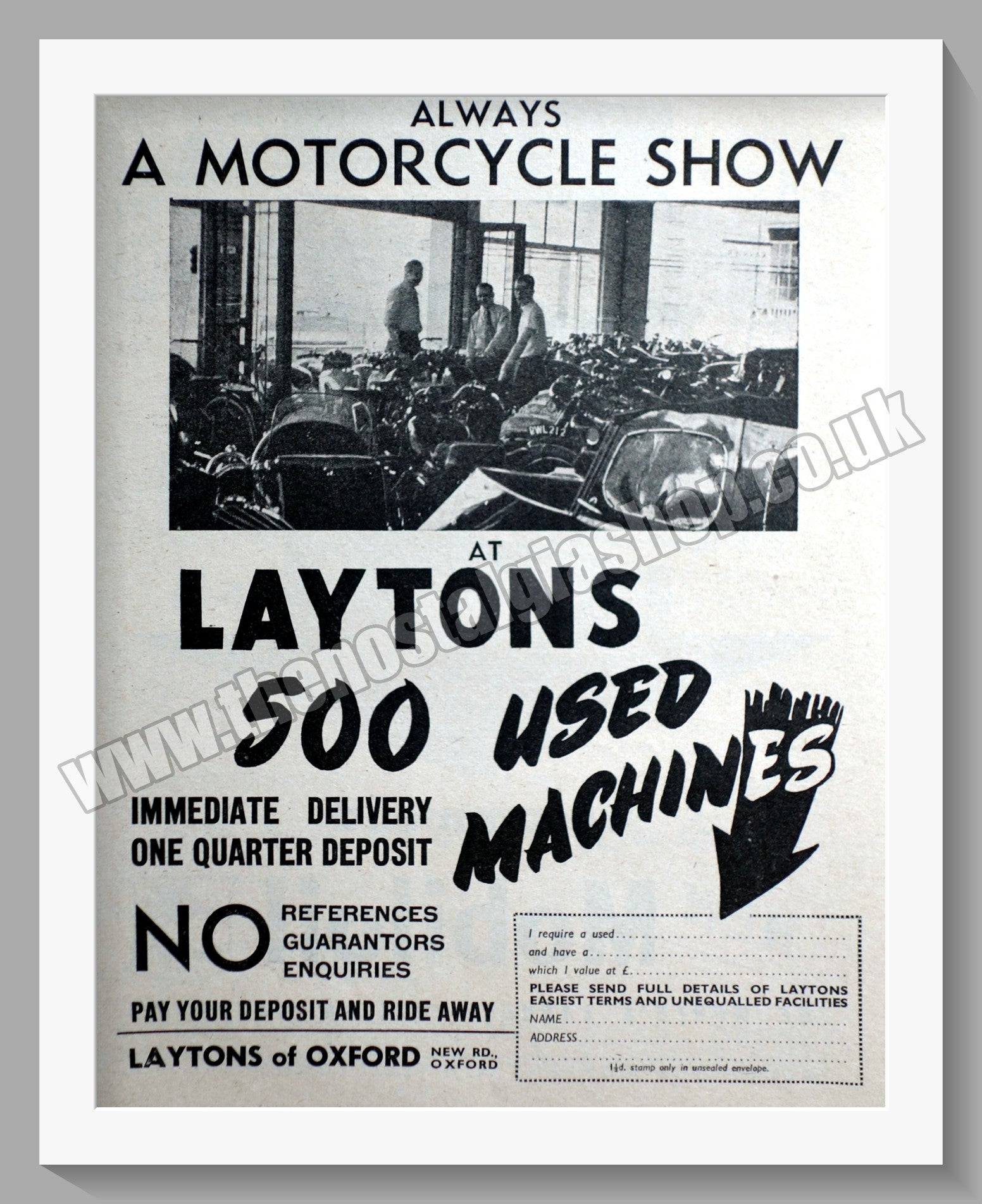 Laytons of Oxford Motorcycle Dealership, London. Classic Original Advert 1951. Presented and Supplied in a 14 x 11 Inch, cream bevel cut mount with backing card and clear bag. Ready to frame. All our adverts, unless clearly stated are Originals from the date shown They make excellent pieces of wall art and stunning gifts. Many are rare and hard to find and once sold, may not be replaced. Remember you are buying a piece of history. Website watermark is not on original. Vintage Motorcycle Dealerships.