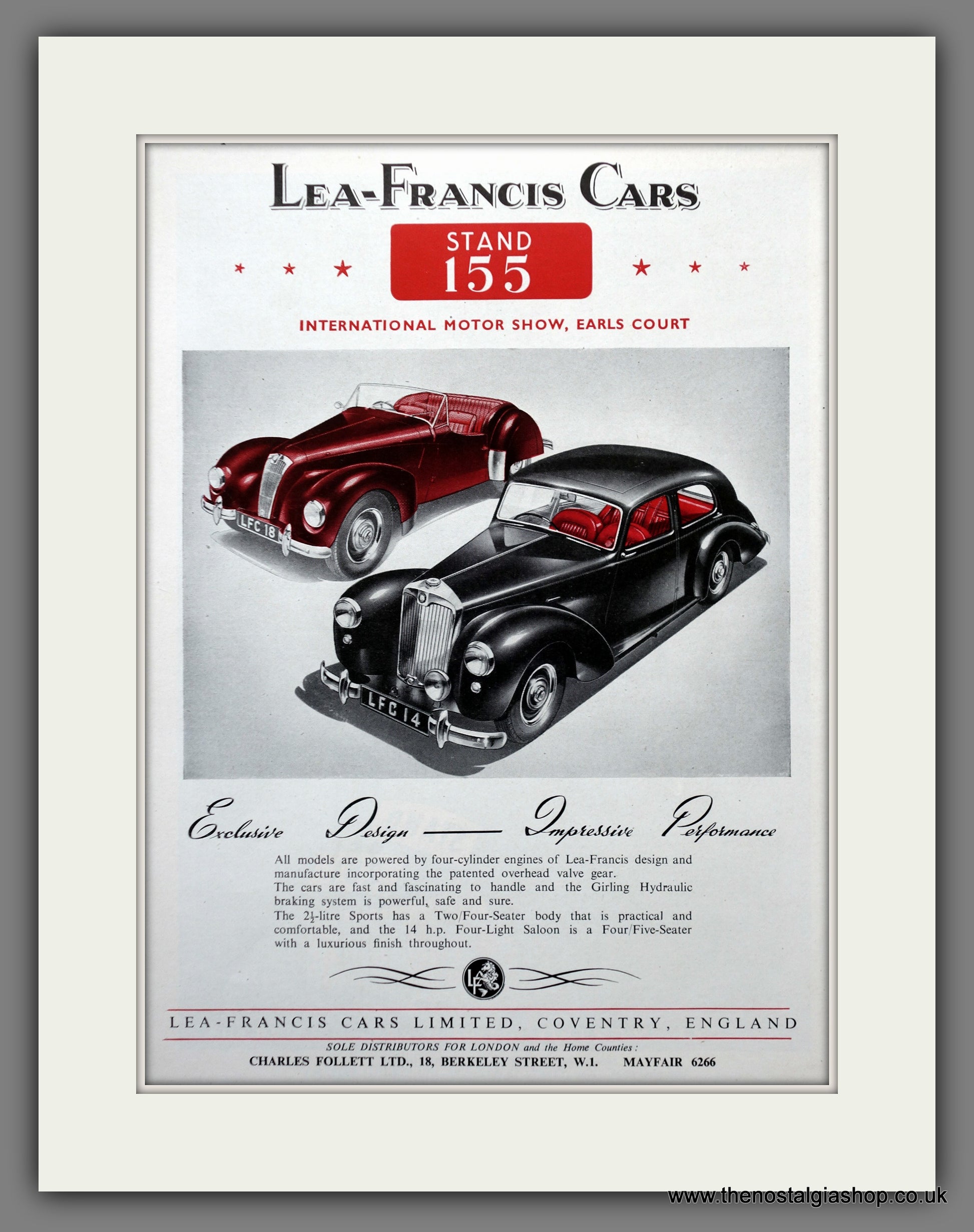Lea Francis. Original Advert 1952. Presented and Supplied in a cream bevel cut mount with backing card. Ready to fit in 14 x 11 inch frame. All our adverts, unless clearly stated are Originals from the date shown They make excellent pieces of wall art and stunning gifts. Many are rare and hard to find and once sold, may not be replaced. Remember you are buying a piece of history. Website watermark is not on original.