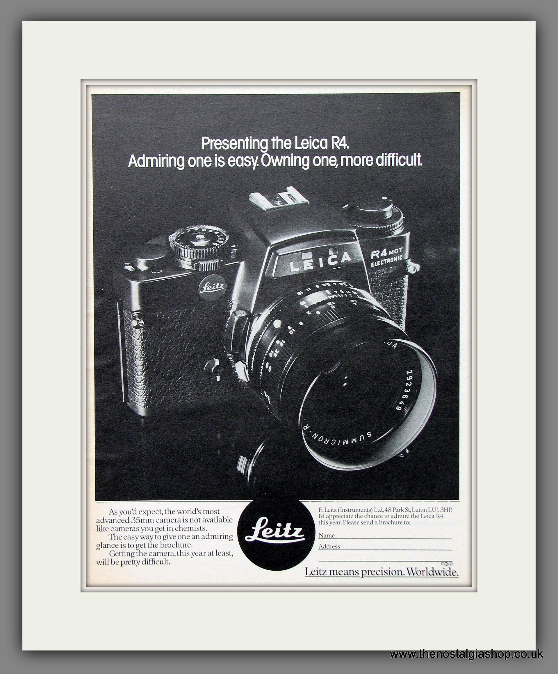 Leitz Leica R4 Camera. Vintage Advert. Classic Original advert 1981. Presented and Supplied in a cream bevel cut mount with backing card and clear bag. Ready to fit in 14 x 11 inch frame. Want it framing? If so, buy this then go to Frames Available Category. Click to buy on the suitable frame and we will do the rest. All our adverts, unless clearly stated are Originals from the date shown. They make excellent pieces of wall art and stunning gifts. Many are rare and hard to find and once sold, may not be replaced. Remember you are buying a piece of history. Website watermark is not on original.