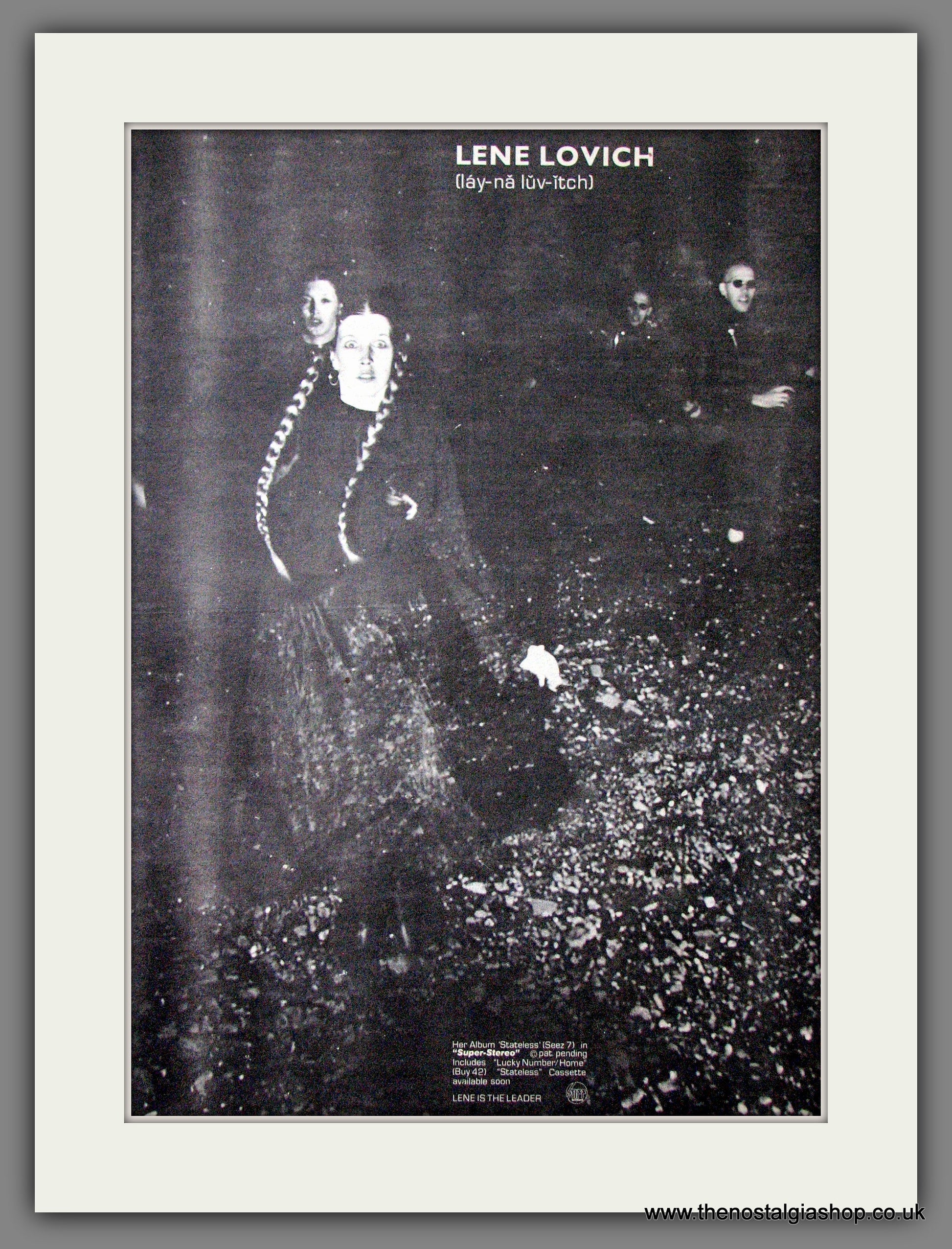 Lene Lovich Stateless. Original Advert 1979 (ref AD12614). Presented and supplied in a cream bevel cut mount with backing card and clear bag. Ready to fit in a 20x16 inch frame. The mounted advert will be posted via courier and well packed - protected with a sheet of hardboard to keep it rigid. Any questions or enquiries, please get in touch, we are here to help! All our adverts, unless clearly stated are originals from the date shown. They make excellent pieces of wall art and stunning gifts. Many are rare and hard to find and once sold, may not be replaced. Remember you are buying a piece of history. Website watermark is not on original.
