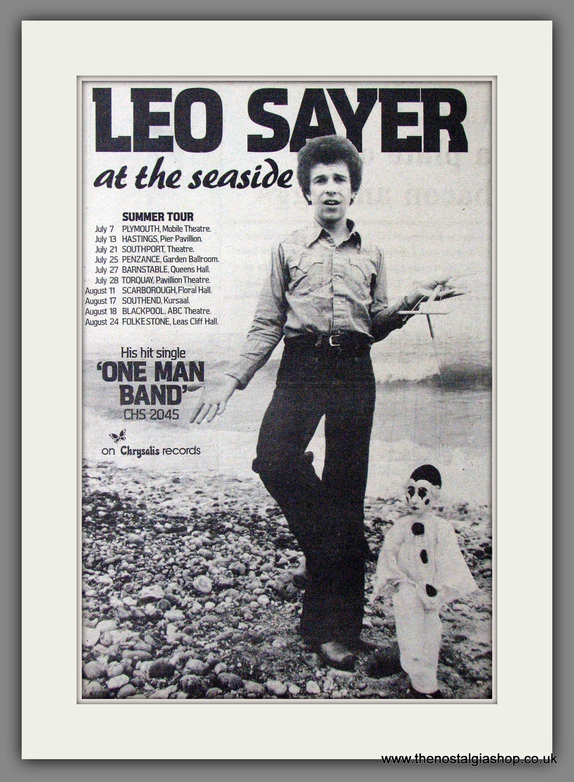 Leo Sayer At The Seaside Summer Tour. Original Advert 1974 (ref AD12637). Presented and supplied in a cream bevel cut mount with backing card and clear bag. Ready to fit in a 20x16 inch frame. The mounted advert will be posted via courier and well packed - protected with a sheet of hardboard to keep it rigid. Any questions or enquiries, please get in touch, we are here to help! All our adverts, unless clearly stated are originals from the date shown. They make excellent pieces of wall art and stunning gifts. Many are rare and hard to find and once sold, may not be replaced. Remember you are buying a piece of history. Website watermark is not on original.