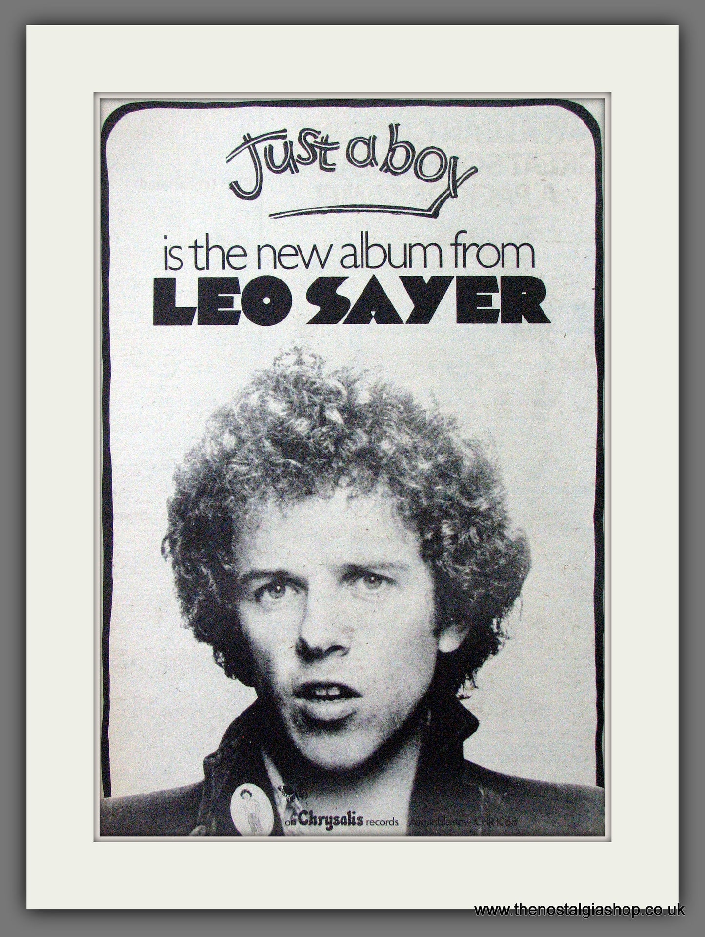 Leo Sayer Just A Boy. Original Advert 1974 (ref AD12642). Presented and supplied in a cream bevel cut mount with backing card and clear bag. Ready to fit in a 20x16 inch frame. The mounted advert will be posted via courier and well packed - protected with a sheet of hardboard to keep it rigid. Any questions or enquiries, please get in touch, we are here to help! All our adverts, unless clearly stated are originals from the date shown. They make excellent pieces of wall art and stunning gifts. Many are rare and hard to find and once sold, may not be replaced. Remember you are buying a piece of history. Website watermark is not on original.