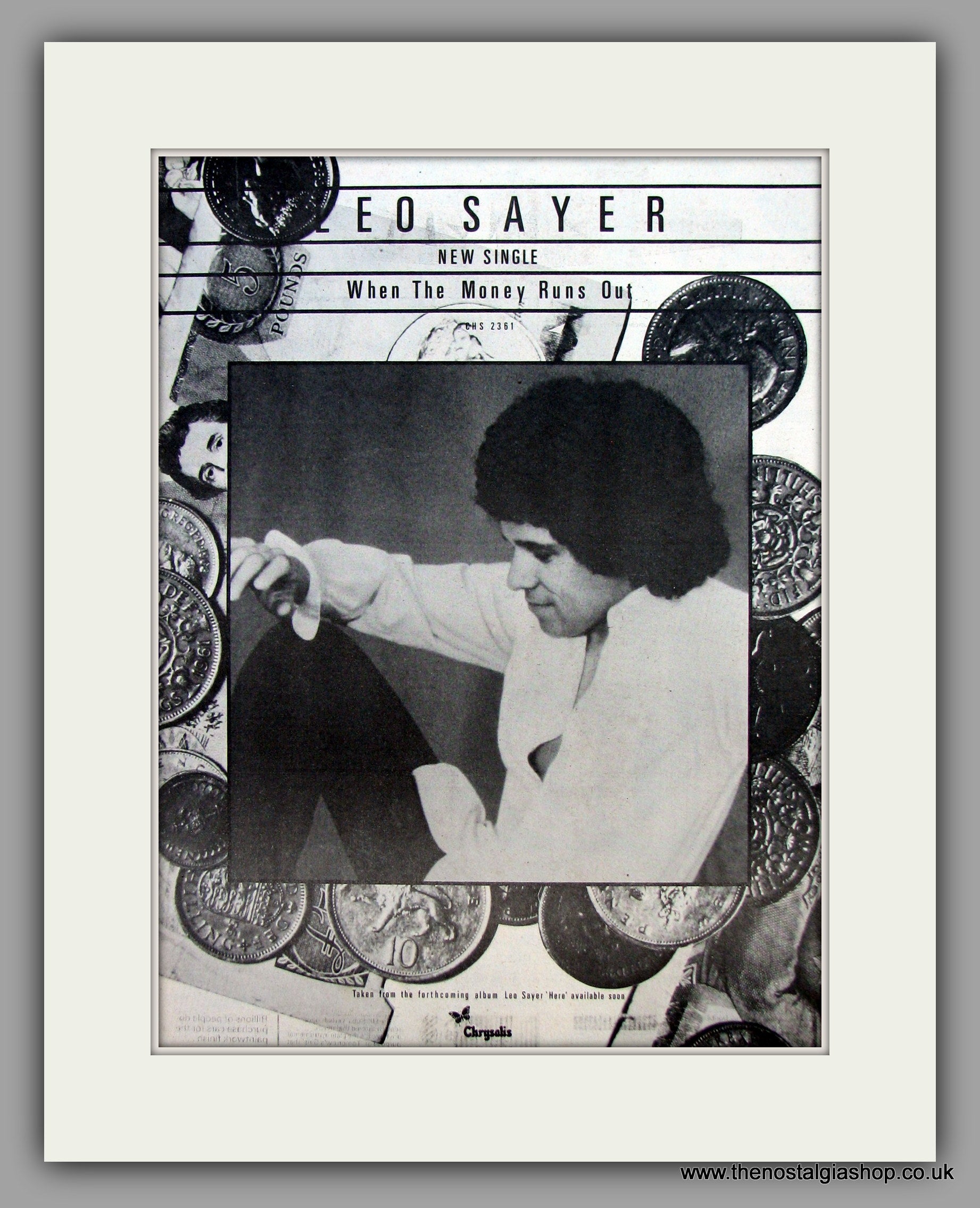 Leo Sayer. When The Money Runs Out. Original Vintage Advert 1979 (ref AD10426). Presented and supplied in a cream bevel cut mount with backing card and clear bag. Ready to fit in a 20x16 inch frame. The mounted advert will be posted via courier and well packed - protected with a sheet of hardboard to keep it rigid. Any questions or enquiries, please get in touch, we are here to help! All our adverts, unless clearly stated are originals from the date shown. They make excellent pieces of wall art and stunning gifts. Many are rare and hard to find and once sold, may not be replaced. Remember you are buying a piece of history. Website watermark is not on original.