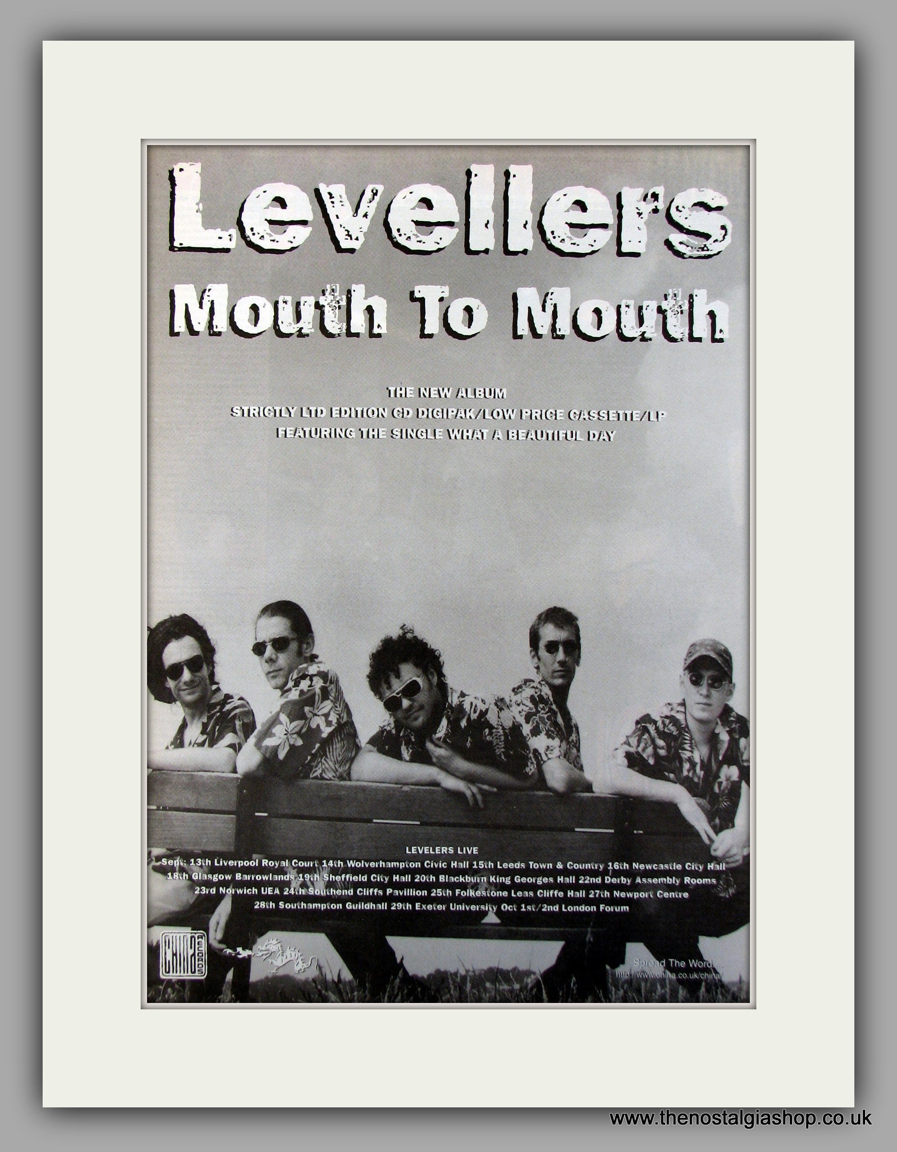 Levellers Mouth To Mouth. Original Vintage Advert 1997 (ref AD10122). Presented and supplied in a cream bevel cut mount with backing card and clear bag. Ready to fit in a 20x16 inch frame. The mounted advert will be posted via courier and well packed - protected with a sheet of hardboard to keep it rigid. Any questions or enquiries, please get in touch, we are here to help! All our adverts, unless clearly stated are originals from the date shown. They make excellent pieces of wall art and stunning gifts. Many are rare and hard to find and once sold, may not be replaced. Remember you are buying a piece of history. Website watermark is not on original.