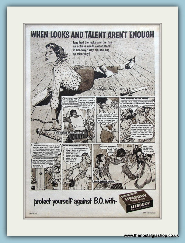 Lifebuoy Toilet Soap. When looks and talent aren't enough...Protect yourself against B.O.... Classic original advert 1955. Presented in cream bevel cut mount with backing card and clear bag. Ready to fit in 14 x 11 inch frame. Want it framing? If so, buy this then go to Frames Available Catagory. Click to buy on the suitable frame and we will do the rest. All our adverts, unless clearly stated are Originals from the date shown They make excellent pieces of wall art and stunning gifts. Many are rare and hard to find and once sold, may not be replaced. Remember you are buying a piece of history. Website watermark is not on original.