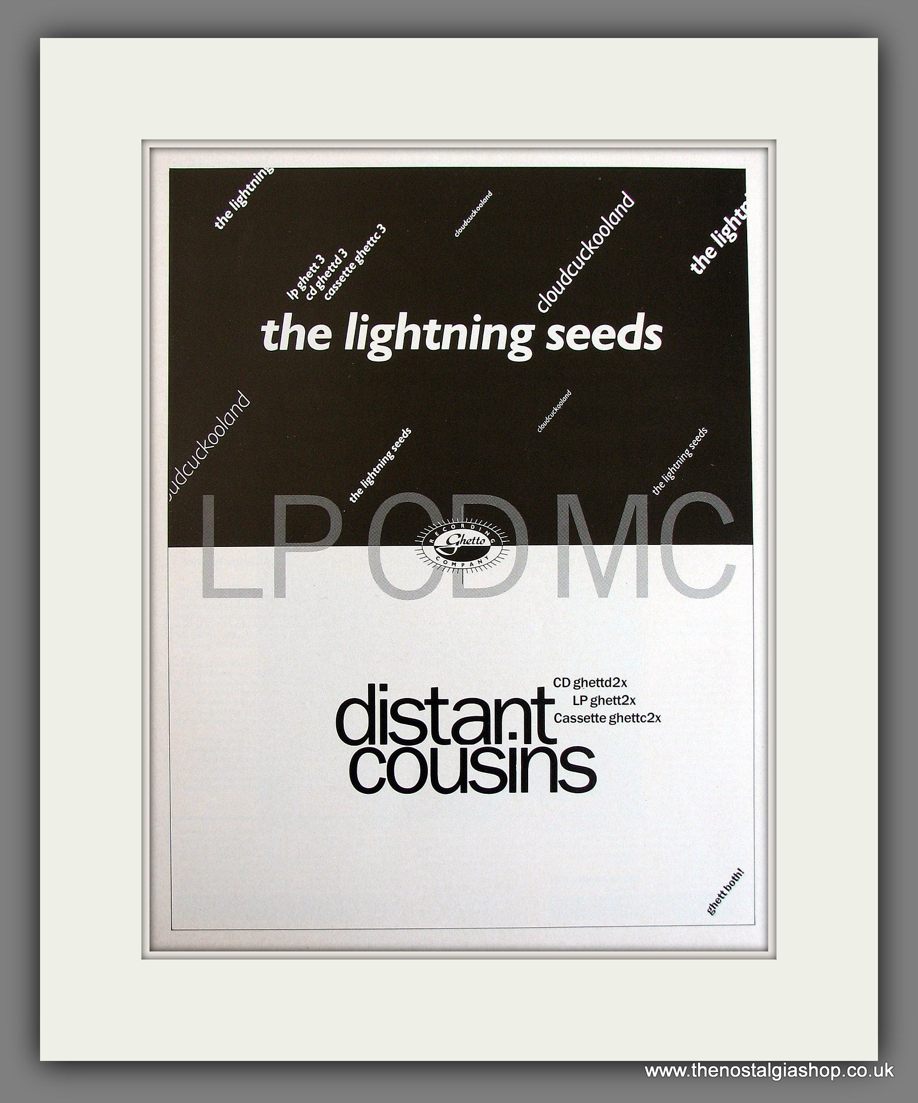 The Lightening Seeds Distant Cousins. Classic Original advert 1990. Presented and supplied in a cream bevel cut mount with backing card and clear bag. Ready to fit in 14 x 11 inch frame. The mounted advert will be posted via courier and well packed - protected with a sheet of hardboard to keep it rigid. Any questions or inquiries, please get in touch, we are here to help! All our adverts, unless clearly stated are Originals from the date shown. They make excellent pieces of wall art and stunning gifts. Many are rare and hard to find and once sold, may not be replaced. Remember you are buying a piece of history. Website watermark is not on original.
